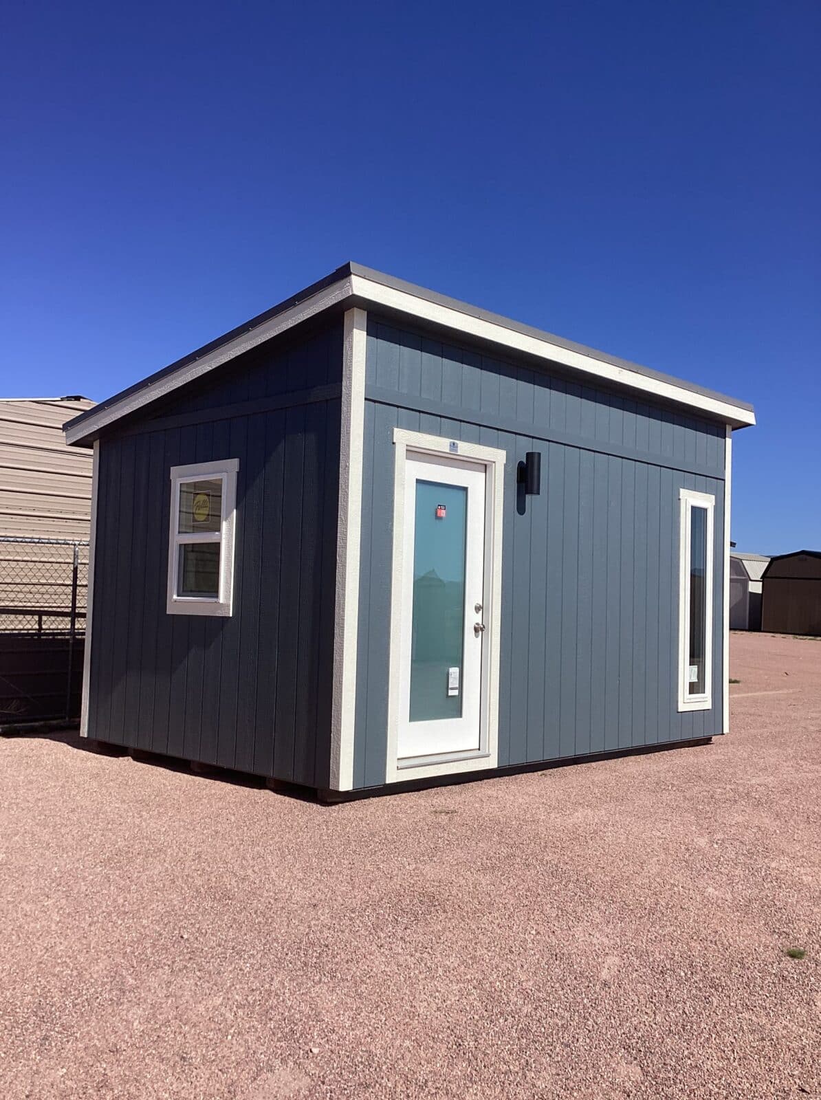 Check out this stunning 10×16 Urban style shed. It features Grays Harbor painted siding, with Dover White painted trim, and a Charcoal Gray metal roof. This shed comes with two 72″x18″ insulated transom windows, one 36″ Smart Glass steel entrance door with window, and one 24″x36″ insulated window, to allow plenty of natural light. It also has a finished out interior with a full electrical package making this shed the perfect space for an office, a workshop, studio, or any custom use you have in mind.
