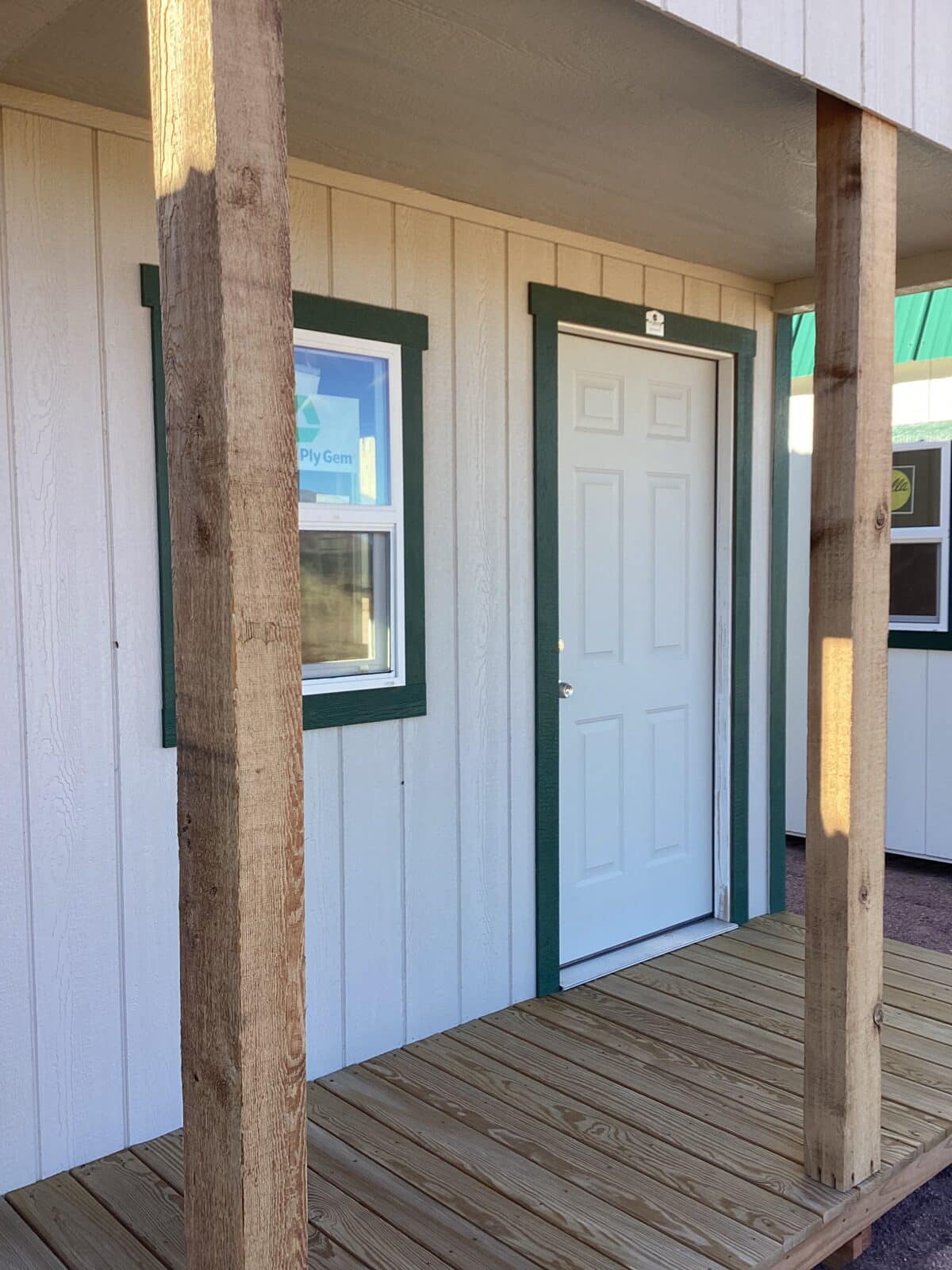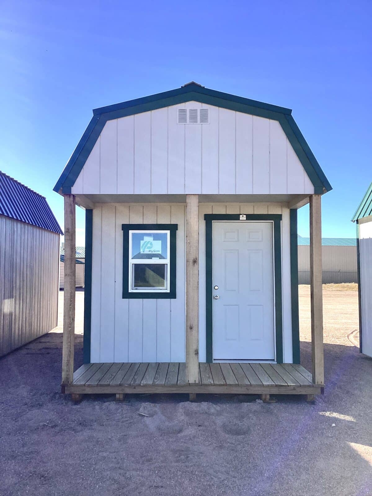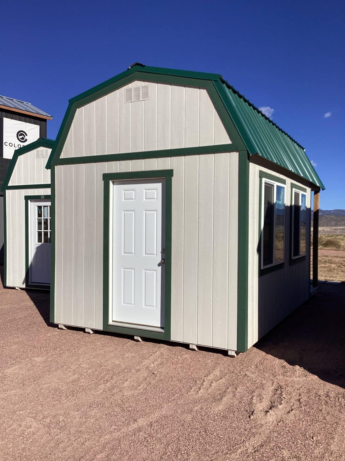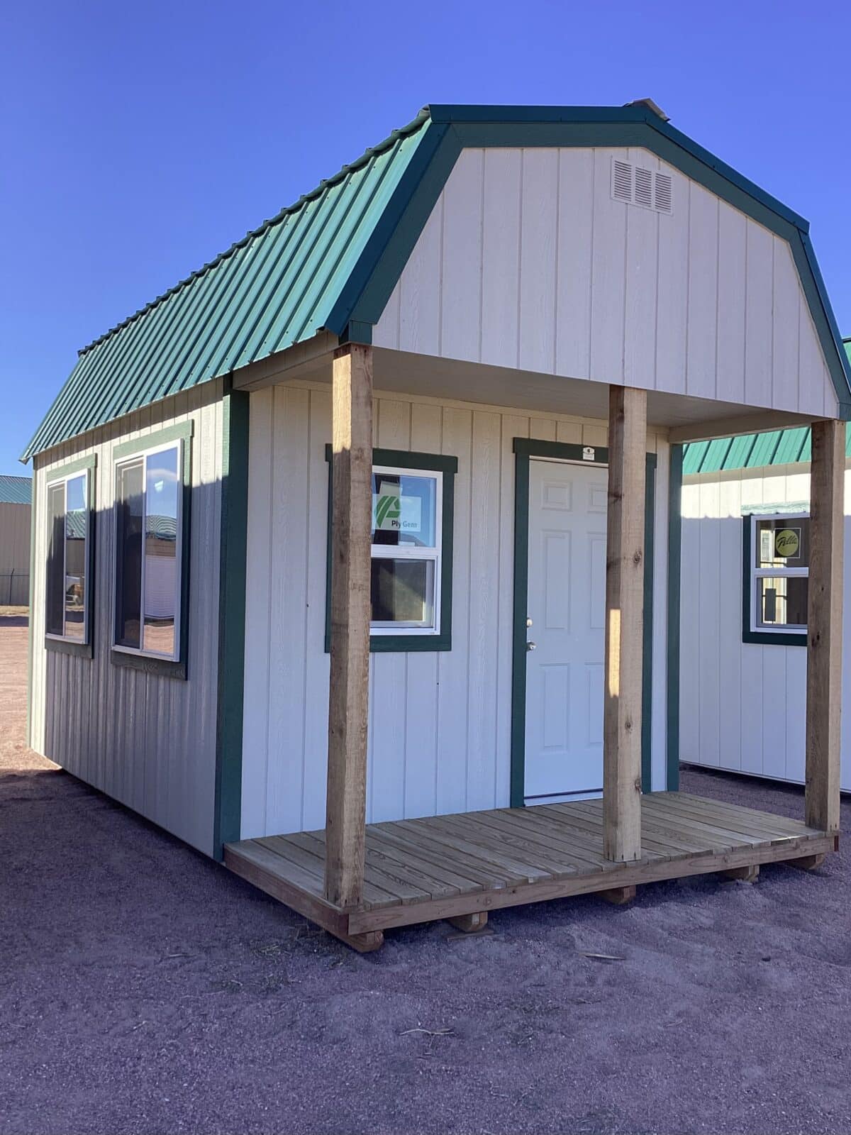 Bring charm and functionality to your property with this spacious 10×18 Barn-Style Shed, designed for versatility and timeless appeal. Featuring a classic barn roofline for maximum overhead storage, this shed offers both beauty and practicality. The inviting 4′ front porch adds character and provides the perfect spot to relax or showcase plants and décor. With plenty of windows, the interior is bright and welcoming—ideal for use as a workshop, studio, garden retreat, or storage space. It’s front and rear doors offer easy access and airflow, making this shed as convenient as it is attractive. With Repose Gray painted siding, Forest Green painted trim, and an Ivy Green Metal roof, this shed is built with quality craftsmanship and durable materials and is ready to enhance your backyard for years to come.