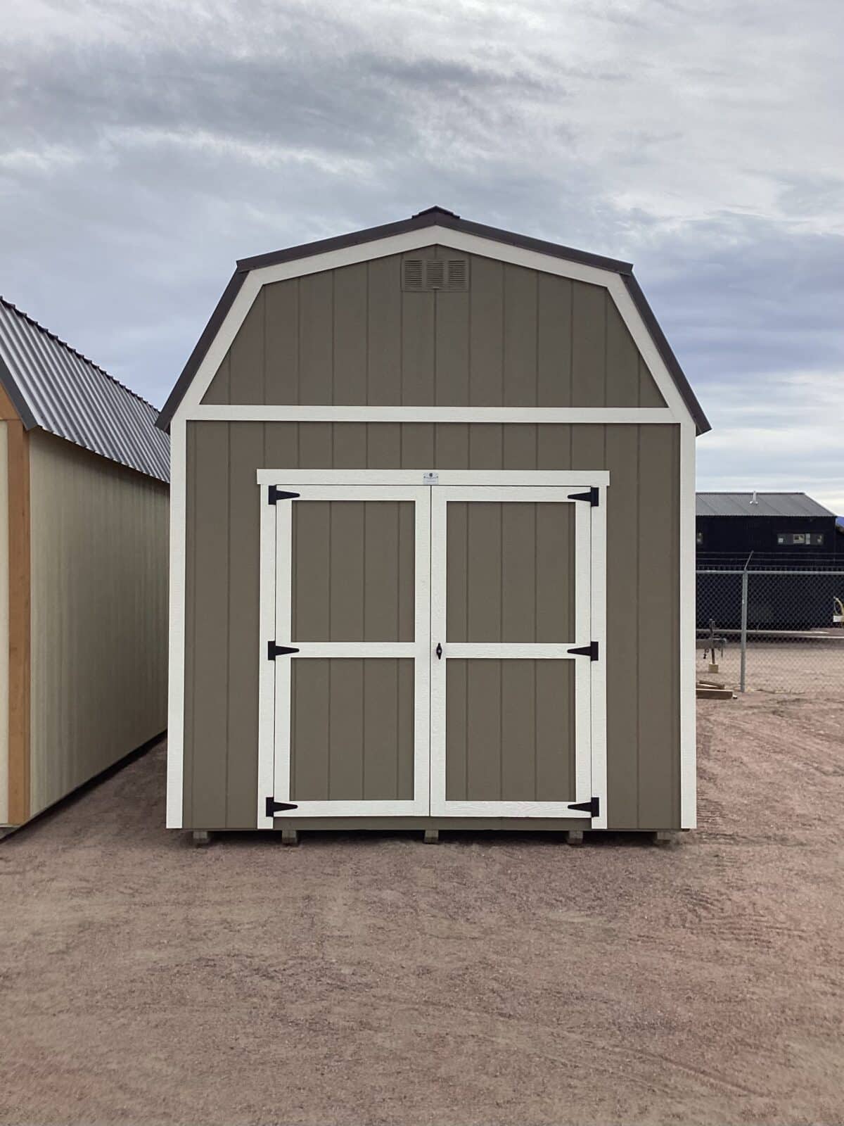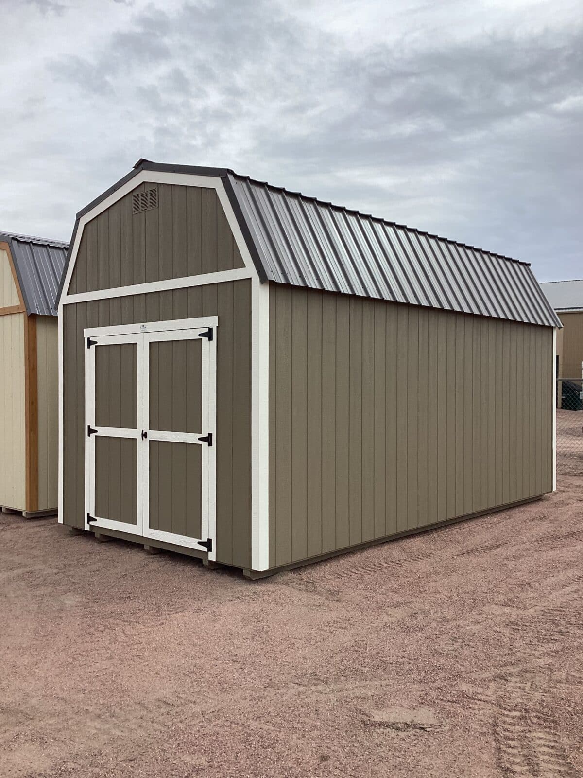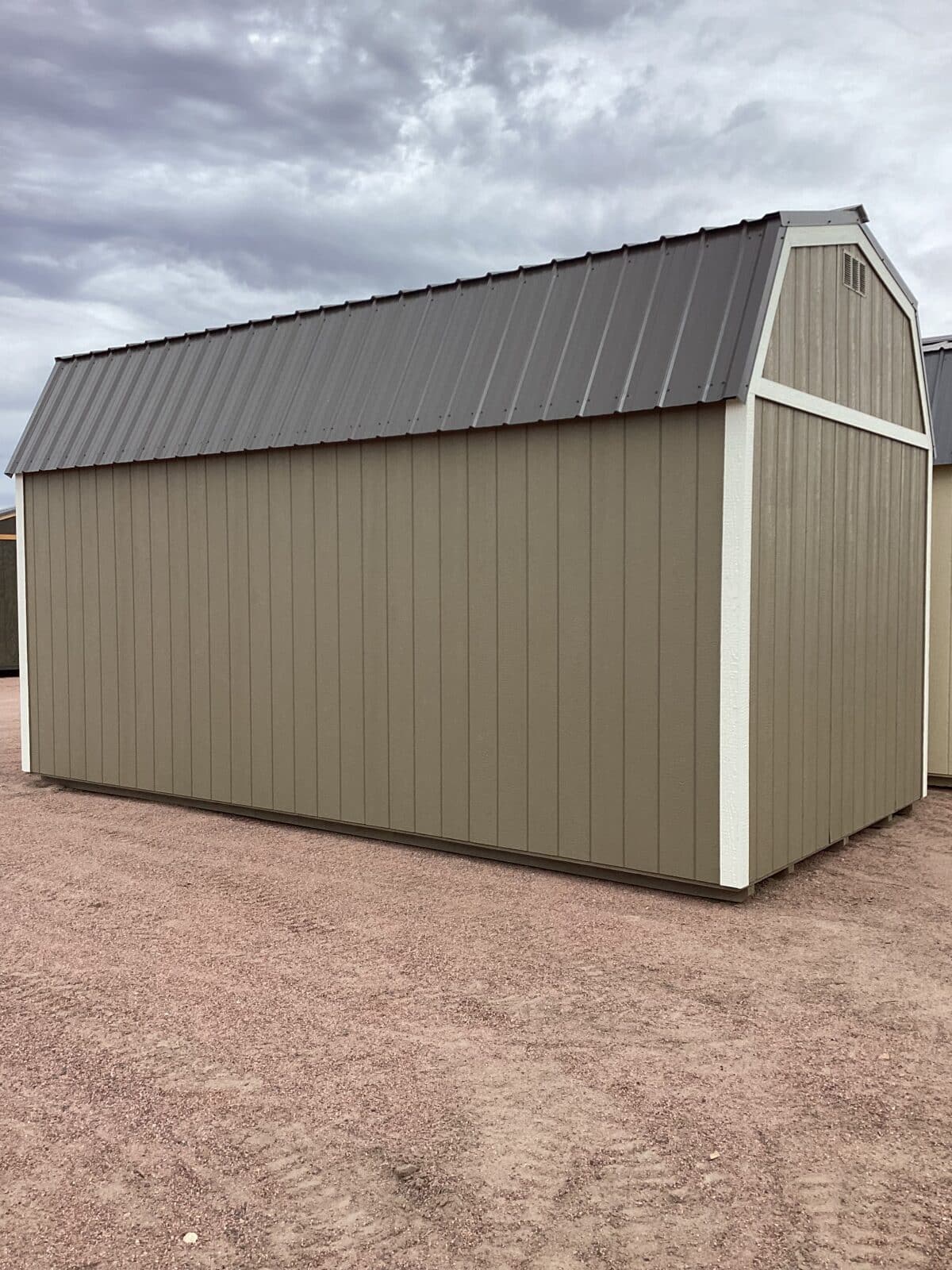 This spacious 10×20 Barn Style Shed combines classic charm with exceptional storage capacity. Featuring a high gambrel roof and a convenient 4-foot loft, it offers plenty of overhead space for storing seasonal items, tools, or outdoor gear while keeping the main floor open and organized. The traditional barn design provides timeless appeal, making it a great addition to any property. Perfect for use as a workshop, garden storage, or hobby space, this shed delivers both style and functionality built to last. With Quiver Tan painted siding, Dover White painted trim, and a Burnished Slate metal roof, this could exactly what you’re looking for! Stop by or call in today at 719-372-7433!