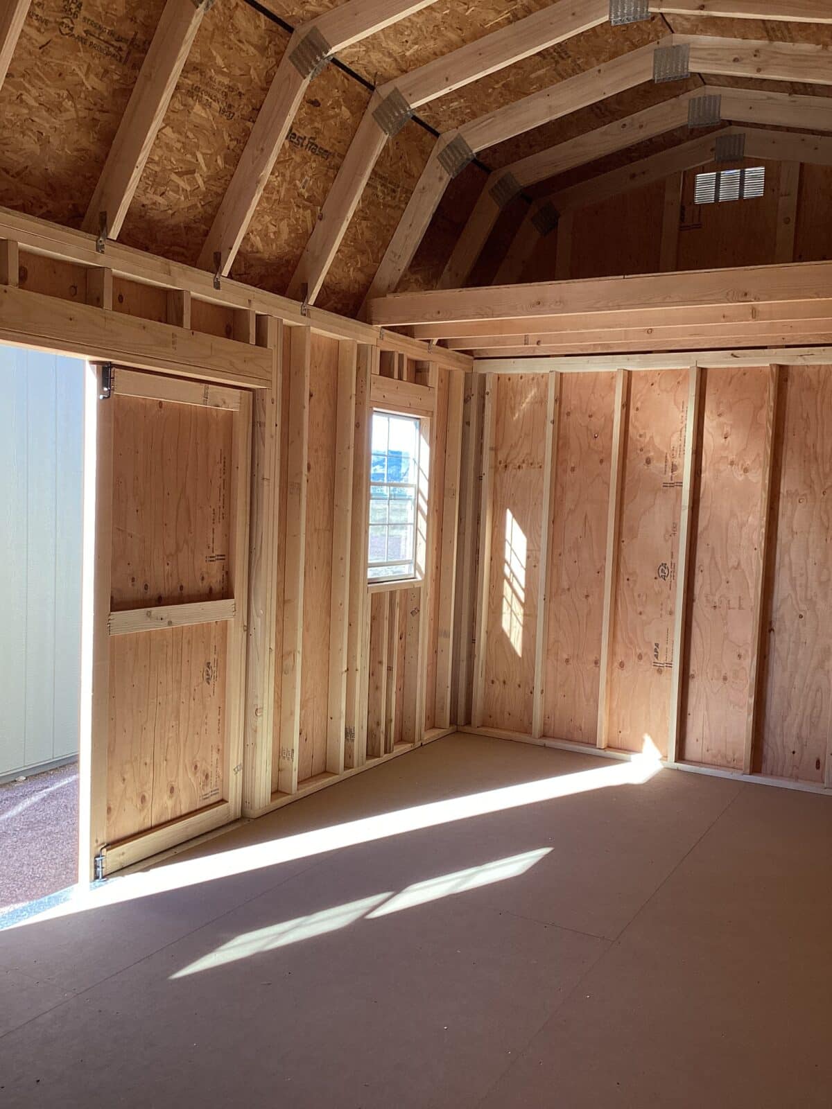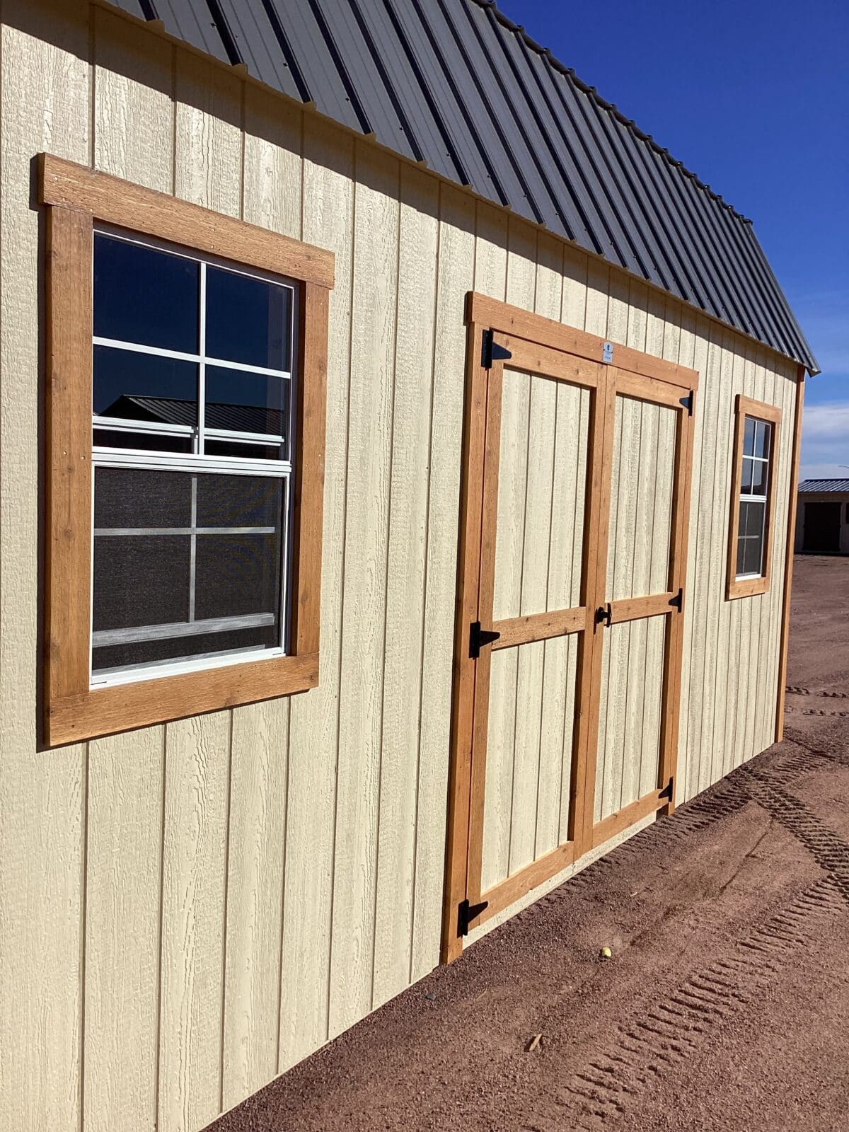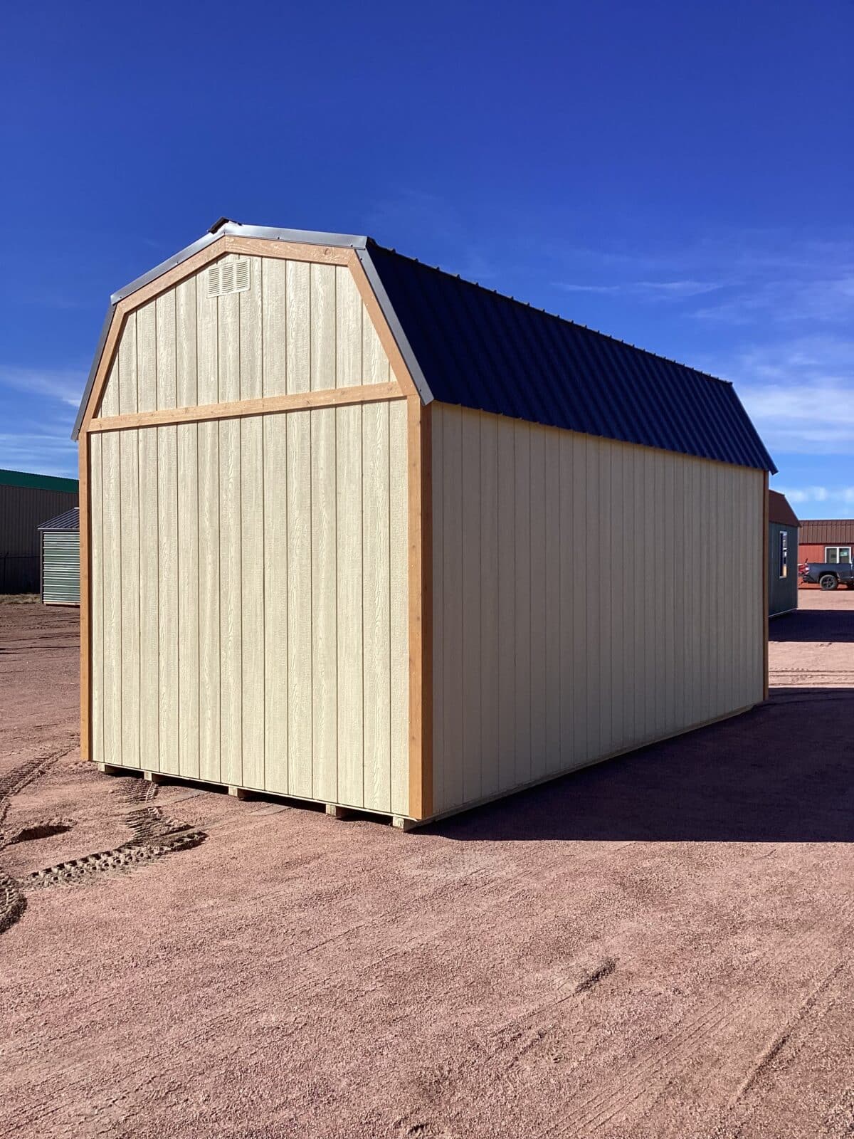 This spacious 10×20 Barn Style Shed combines classic barn charm with exceptional storage capacity. Featuring two convenient 4-foot lofts, it offers plenty of overhead space for storing seasonal items, tools, or equipment, while keeping the main floor open for larger items. The wide 6-foot double doors make it easy to move mowers, ATVs, or bulky supplies in and out with ease. With its tall barn-style roof and sturdy construction, this shed delivers both functionality and timeless appeal—perfect for anyone needing extra space with a rustic touch. This shed is painted Believable Buff, Natural stained cedar trim and a Charcoal Gray metal roof.