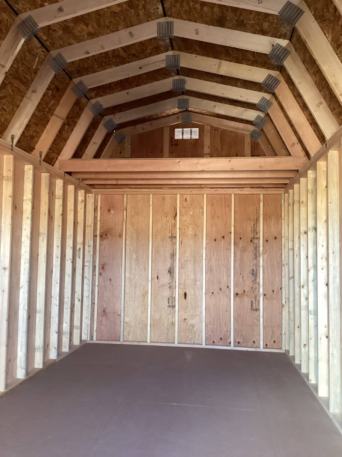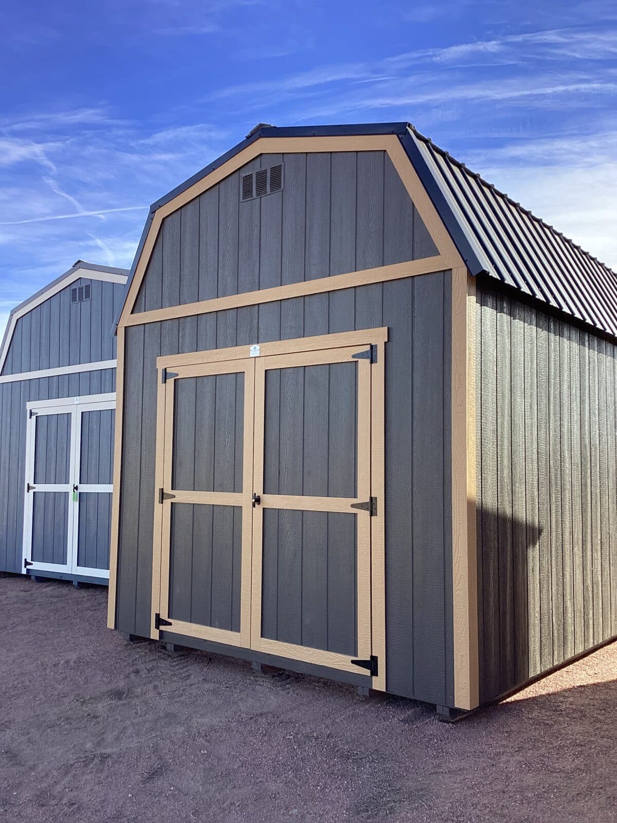 A 10×20 Barn Style shed that delivers both charm and capability, this spacious structure features 6′ double doors.. Inside, you’ll find generous storage thanks to a 4′ loft—perfect for keeping seasonal items, tools, or totes neatly organized and out of the way. The exterior showcases durable Urban Bronze painted siding accented with crisp Lanyard trim, all topped with a striking Black metal roof for a clean, professional look. This shed blends style and practicality, making it an ideal solution for anyone needing serious storage with classic barn appeal.