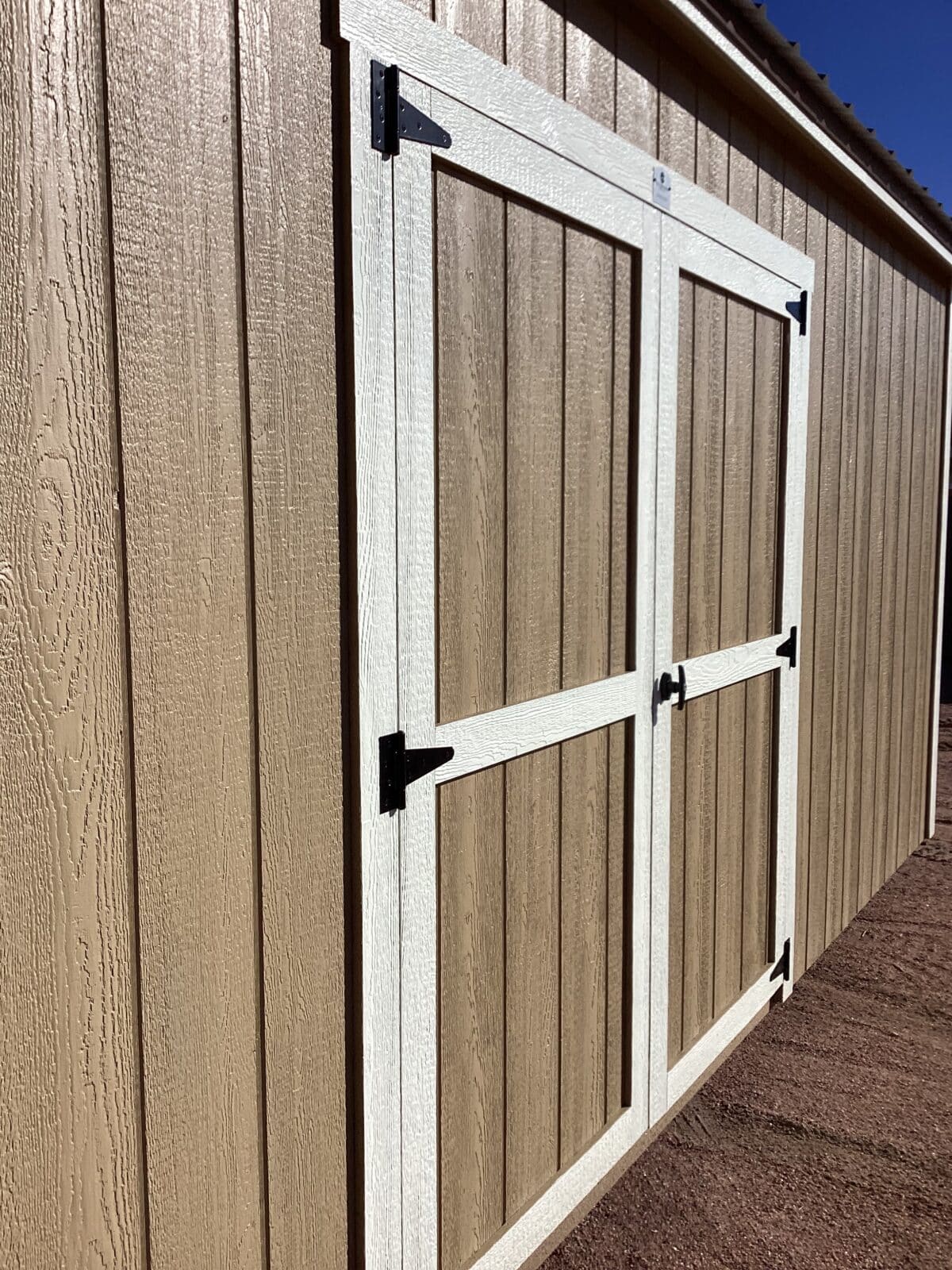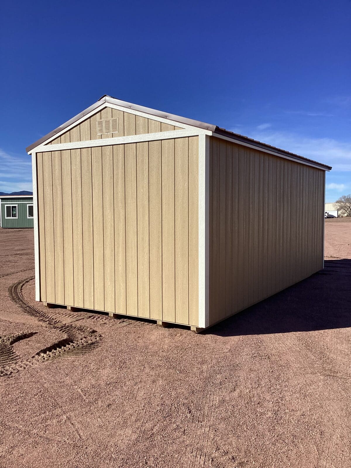 A spacious and versatile solution, our 10×20 Gable-Style Shed offers classic curb appeal and dependable functionality for any property. The wide 6′ double doors provide easy access for lawn equipment, tools, bikes, or larger storage needs, while the generous interior footprint gives you plenty of room to organize, work, or create. Built with durable craftsmanship and a timeless roofline, this shed delivers long-lasting value and a polished look that enhances your outdoor space. This shed is painted Sahara Tan with Dover White trim and a Koko Brown metal roof. Call in or stop by today!
