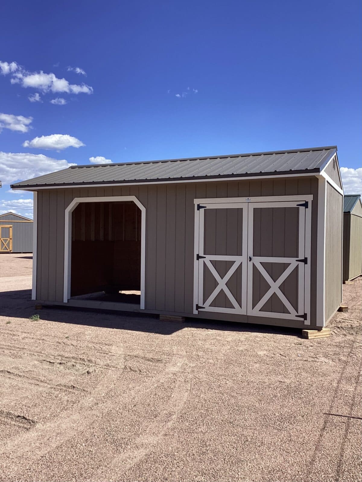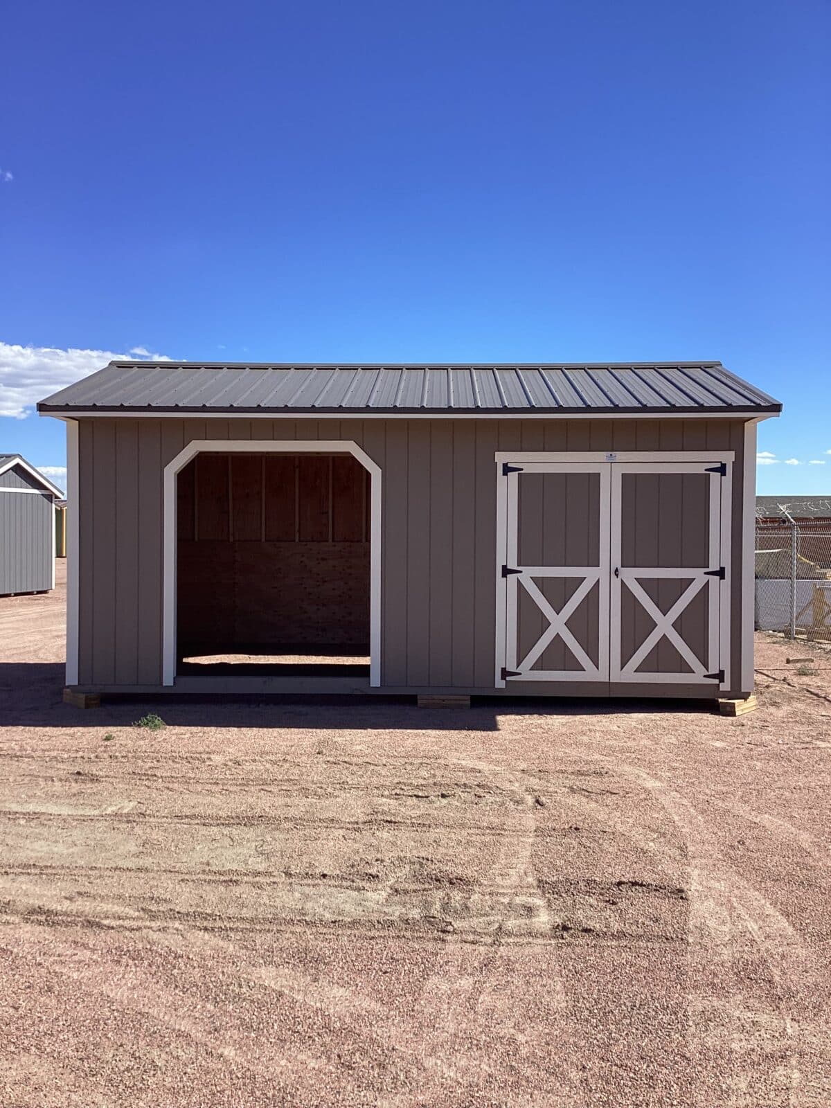 Protect your livestock and keep your supplies organized with this versatile Loafing Shed with built in storage. It’s open-front design provides easy access and excellent ventilation, ideal for horses, cattle, goats, or sheep. Designed for functionality and durability, this multi-purpose structure provides a safe, shaded space for animals to rest while offering a convenient, enclosed storage area for feed, tools, or equipment. With Buckskin painted siding, Dover White painted trim, and a Burnished Slate metal roof, this shed is built to look good and last. Call in now!