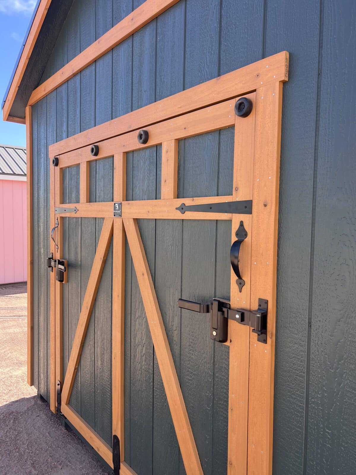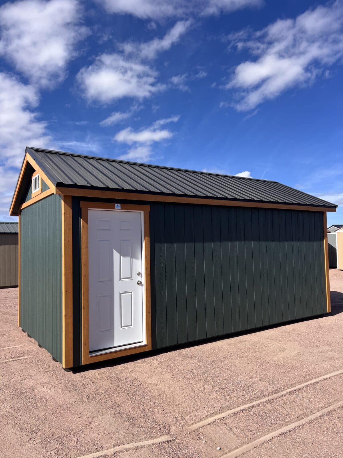 This 10×20 Studio blends bold style with everyday functionality, making it a standout addition to any property. Painted in rich Fern Green siding and accented with natural stained cedar trim, it offers a warm, modern look that pairs beautifully with the durable black crinkle metal roof. The wide 6×6 Rampage door provides easy access for equipment or larger items, while the 36″ steel entrance door adds security and convenience for daily use. A striking 10×24 transom window floods the interior with natural light, creating a bright, inviting space perfect for a studio, workshop, or creative retreat.
