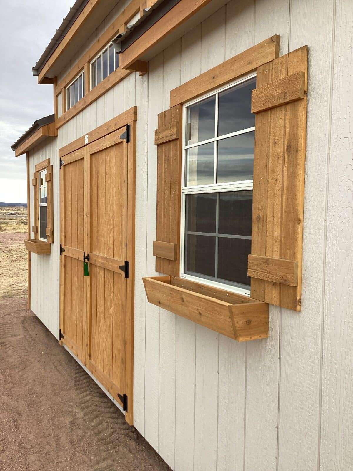 Transform your backyard into a versatile, stylish space with our 10×20 Studio Shed — the perfect blend of function and charm. Featuring 6′ double doors, this shed offers wide, easy access for large equipment, workshop projects, or creative studio setups. Two 24×36 windows with classic shutters and charming flower boxes invite natural light and warmth, creating an inviting atmosphere for work or relaxation. Whether you’re designing a home office, art studio, garden retreat, or extra storage, this beautifully crafted shed combines durability, space, and curb appeal to elevate your outdoor living. Painted Repose Gray with beautiful Natural stained cedar trim and a Charcoal Gray metal roof, this shed could be exactly what you’re looking for!
