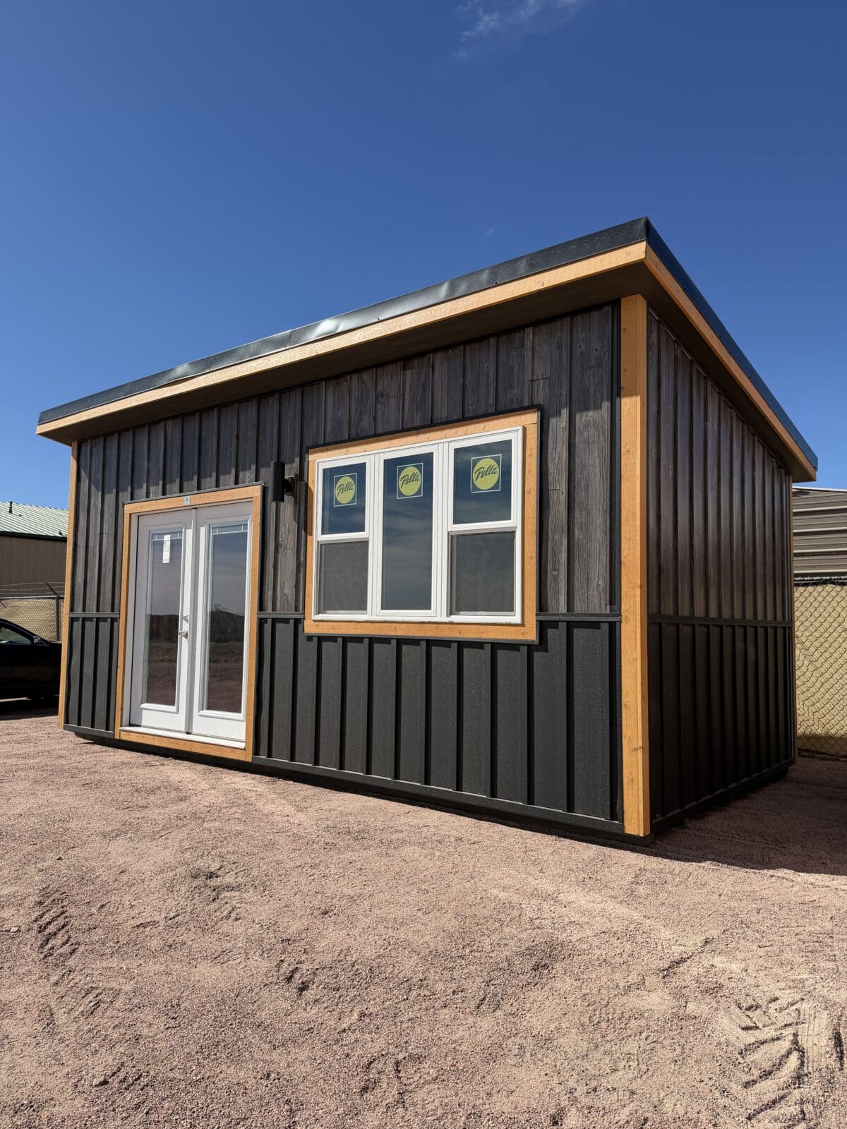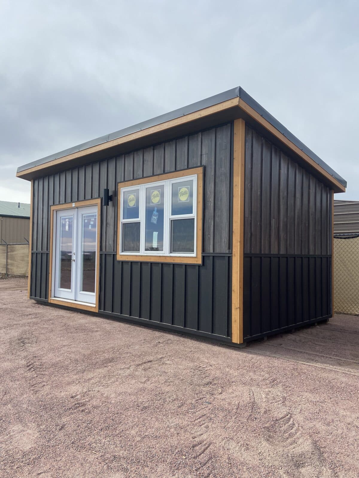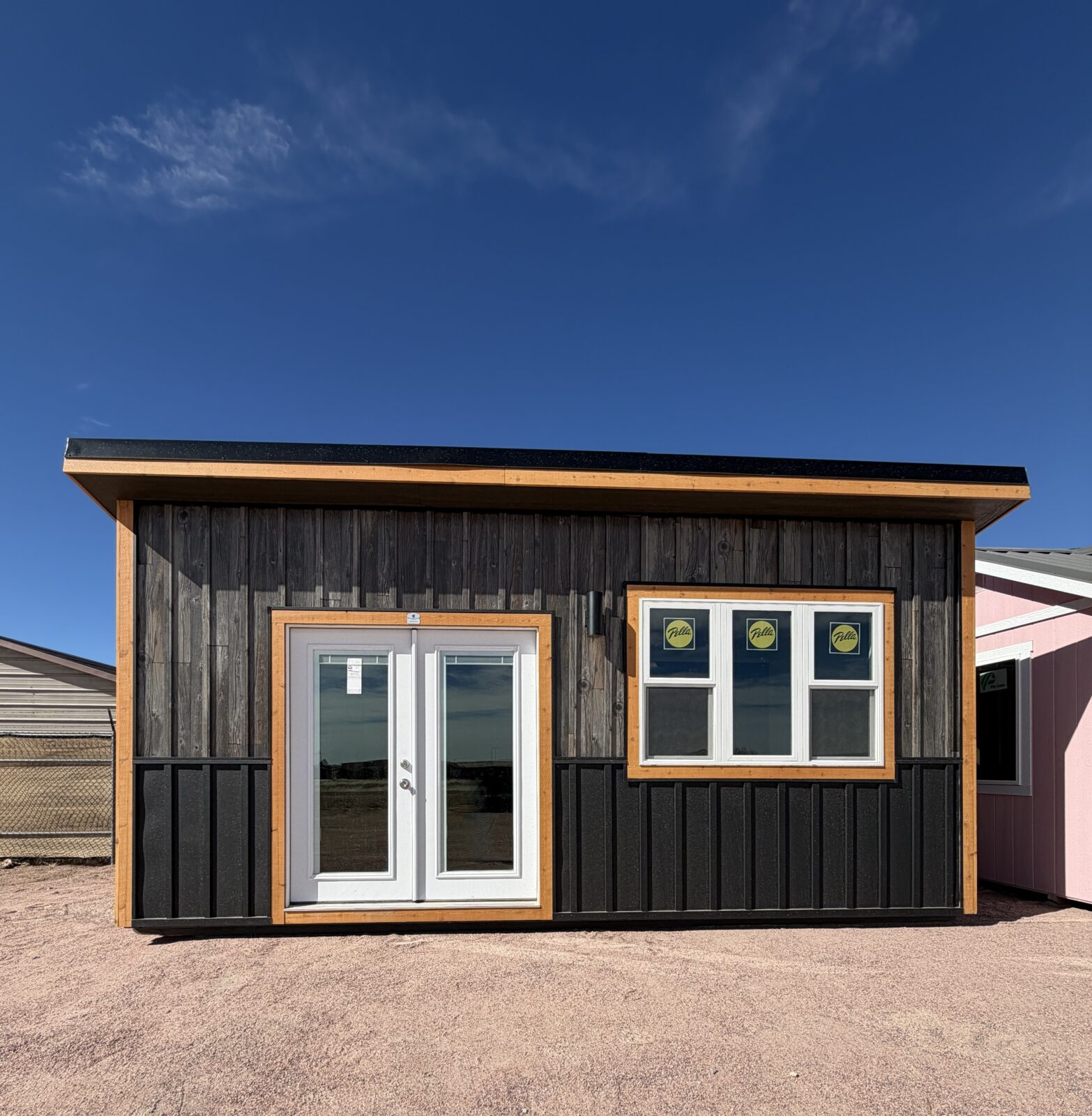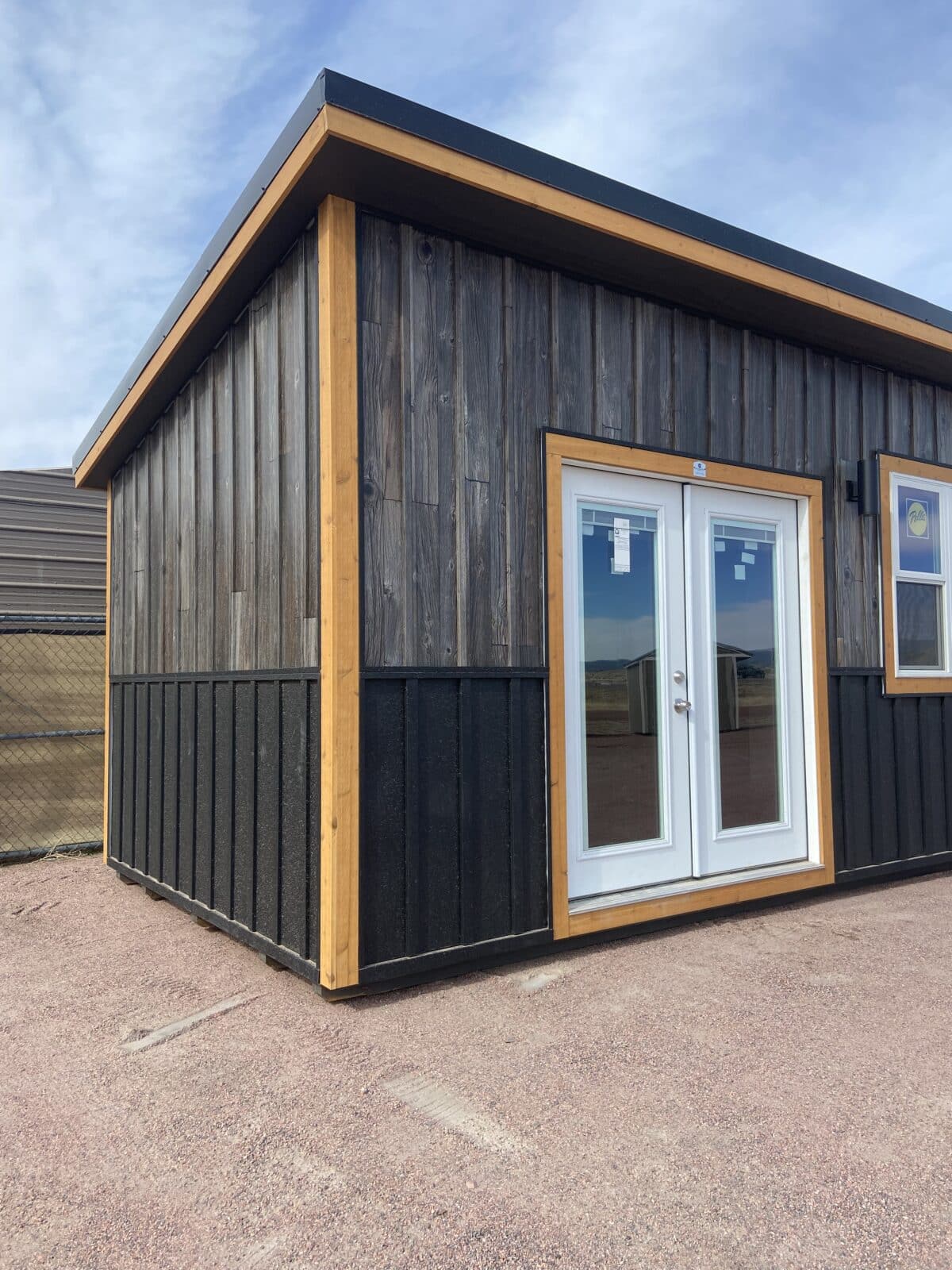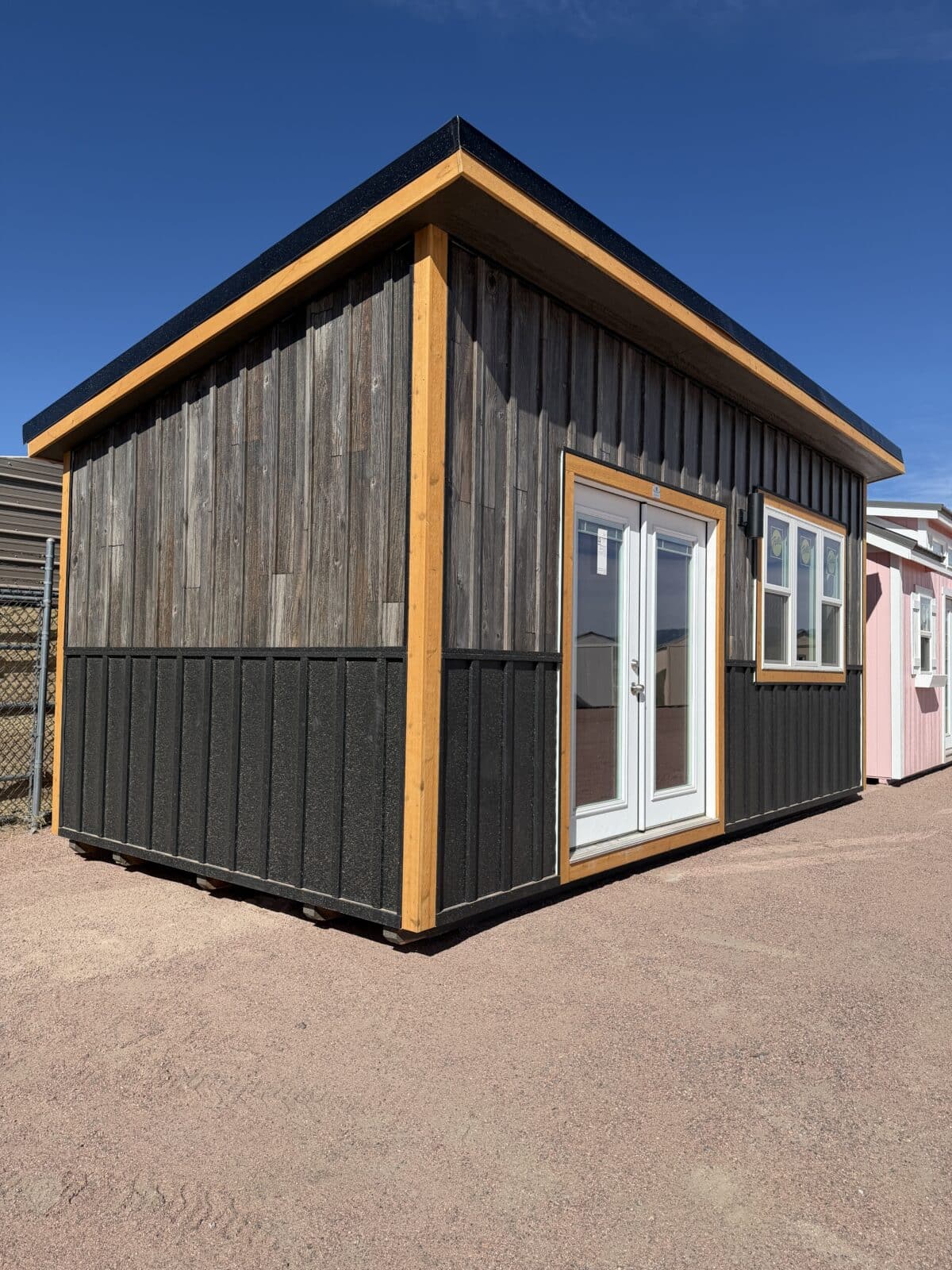 Elevate your workspace with our Urban Style Home Office—a modern, design-forward structure built to blend functionality with striking architectural detail. The exterior features durable metal board-and-batten siding paired with an upper section finished in an antique barnwood plank pattern, creating a warm, reclaimed look with contemporary contrast. A bold black crinkle board-and-batten wainscot anchors the design, while natural cedar trim adds depth, definition, and a touch of organic character. Topping it off is a sleek black metal roof that delivers long-lasting performance and a clean, modern profile.