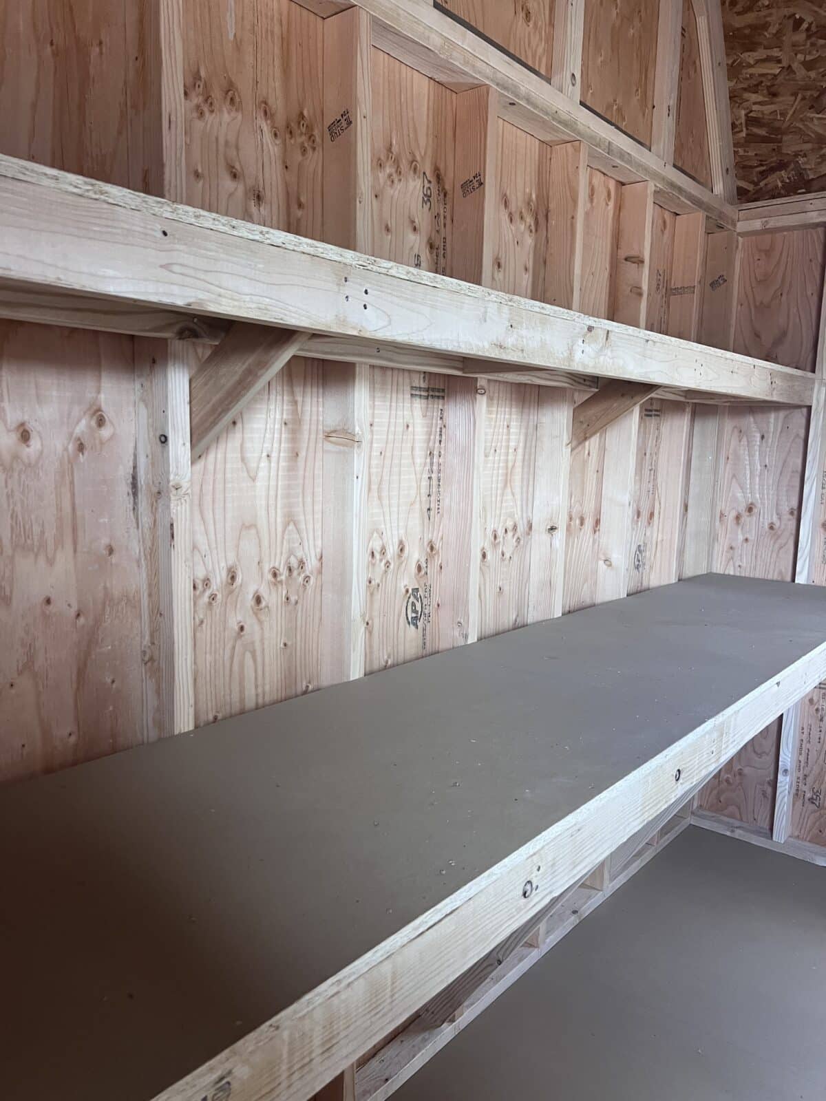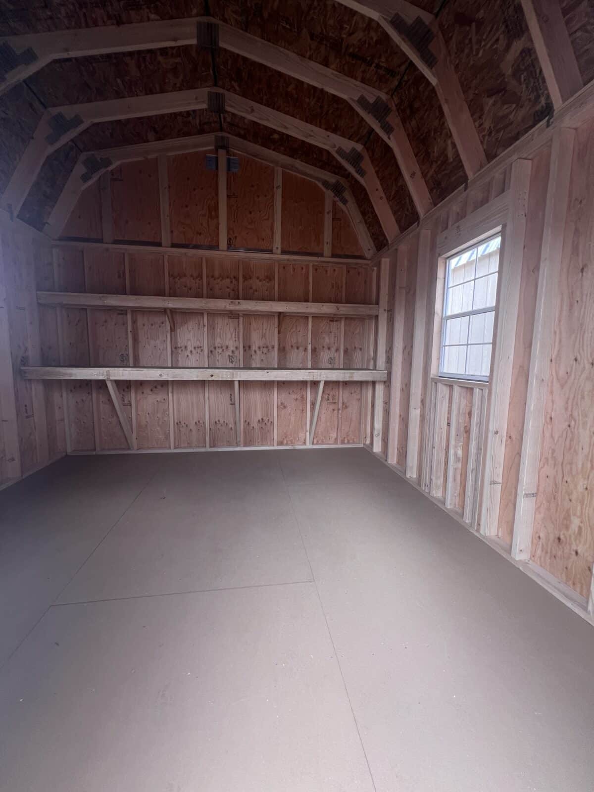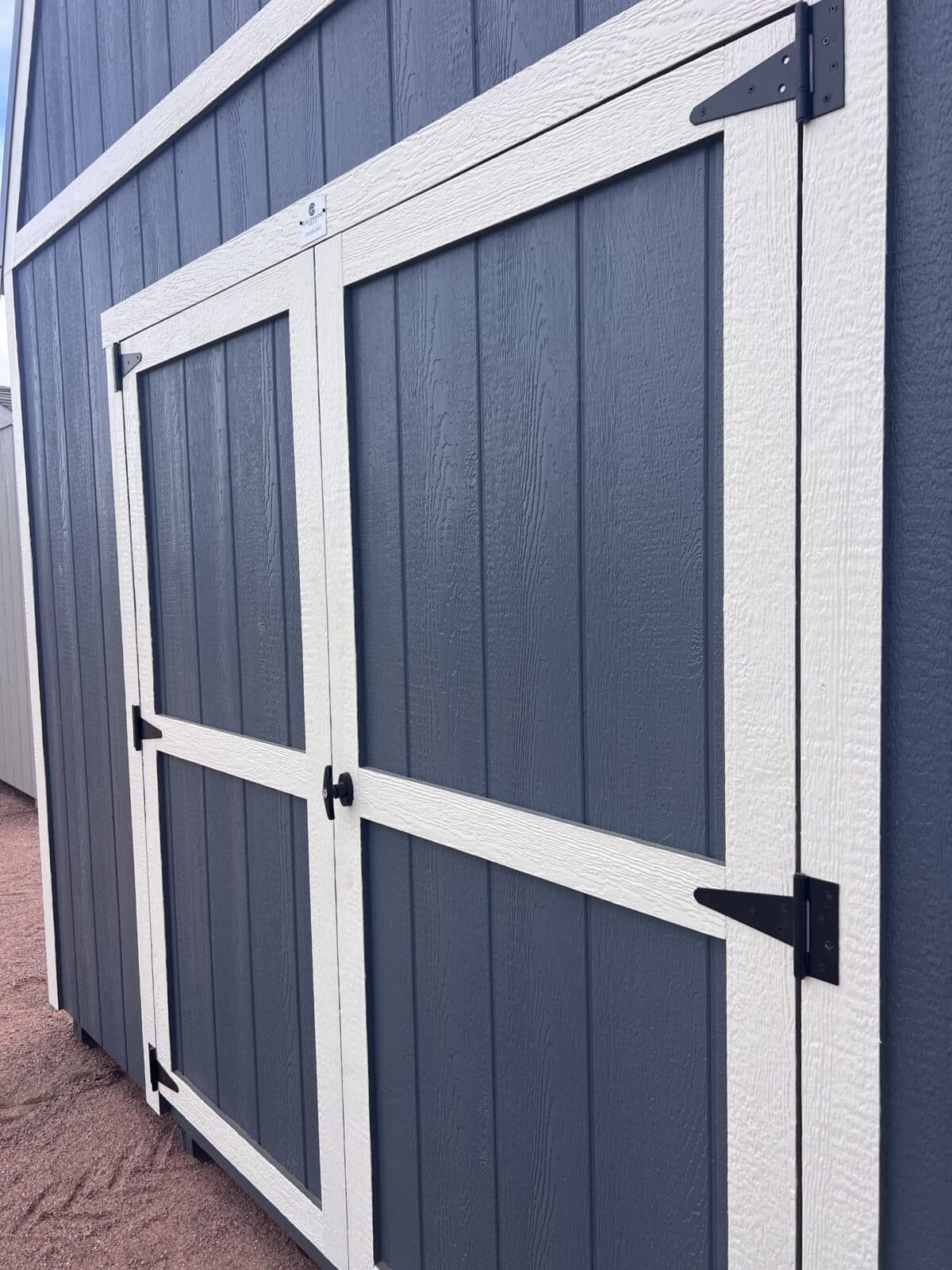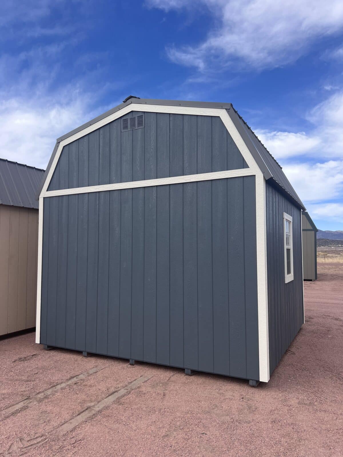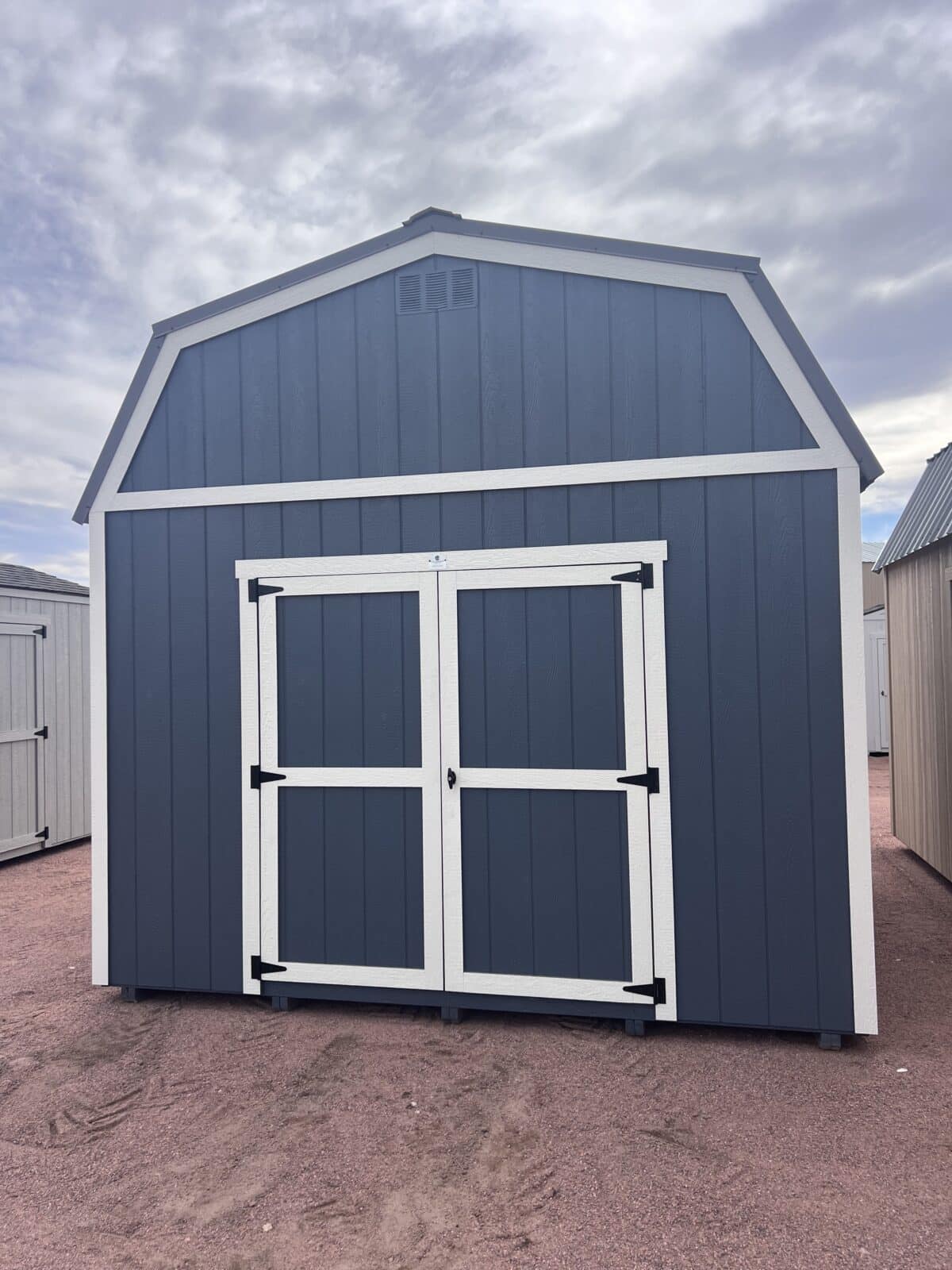 This 12′ x 12′ barn-style shed offers a practical blend of storage and workspace with a classic design. The shed features 6′ wide double doors for easy access to larger equipment and tools. Inside, a 2′ x 12′ loft above the doors provides convenient overhead storage, helping keep the main floor area open and organized. On the far end of the shed, a 2′ workbench paired with a 1′ shelf creates a functional space for projects, tool organization, or small repairs. Natural light enters through two 24″ x 36″ non-insulated windows, brightening the interior and improving visibility. The exterior is finished in Grays Harbor paint with Dover White trim, giving the shed a clean, modern look, while a Charcoal Gray metal roof adds durability and long-lasting protection from the elements.