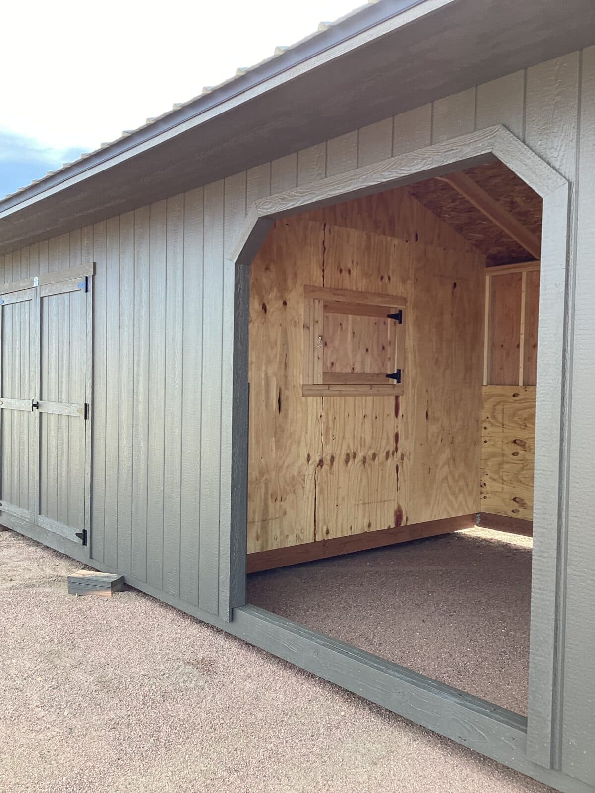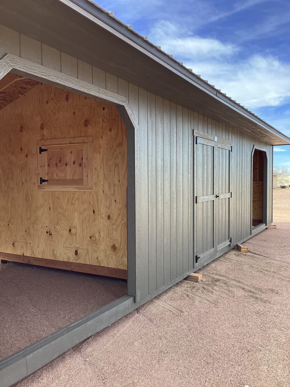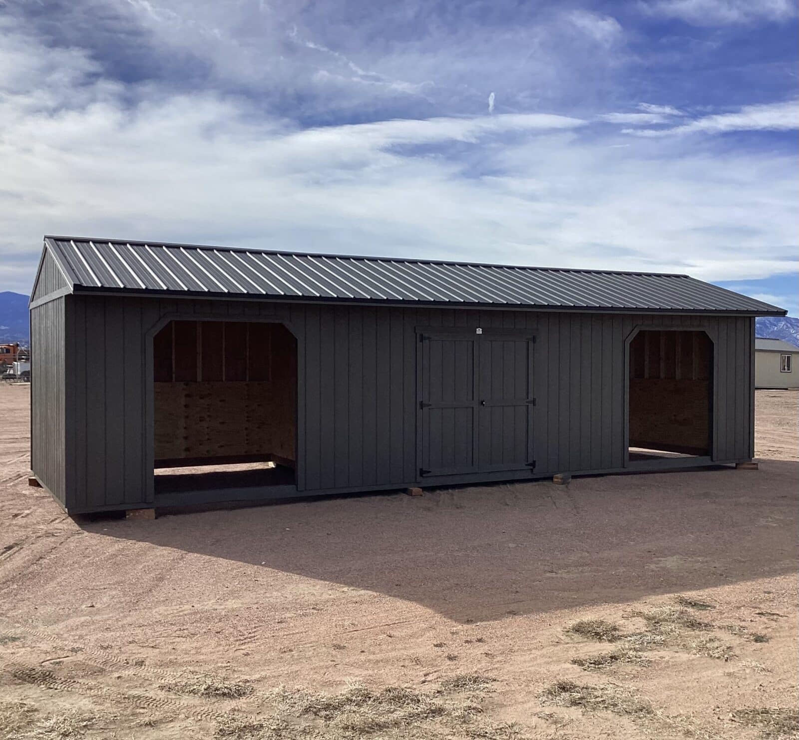 A two-stall loafing shed with a center tack room gives you the perfect blend of shelter, storage, and daily convenience. Each spacious stall offers reliable protection for your animals, while the middle tack room keeps your gear organized, secure, and easy to access. With convenient feed doors on each side, you can care for your livestock quickly and efficiently without entering the stalls. Built for durability and year-round function, this setup is an ideal, low-maintenance solution for anyone looking to simplify their livestock management while keeping animals comfortable and protected. This shed is painted Urban Bronze with matching trim and a Black metal roof.