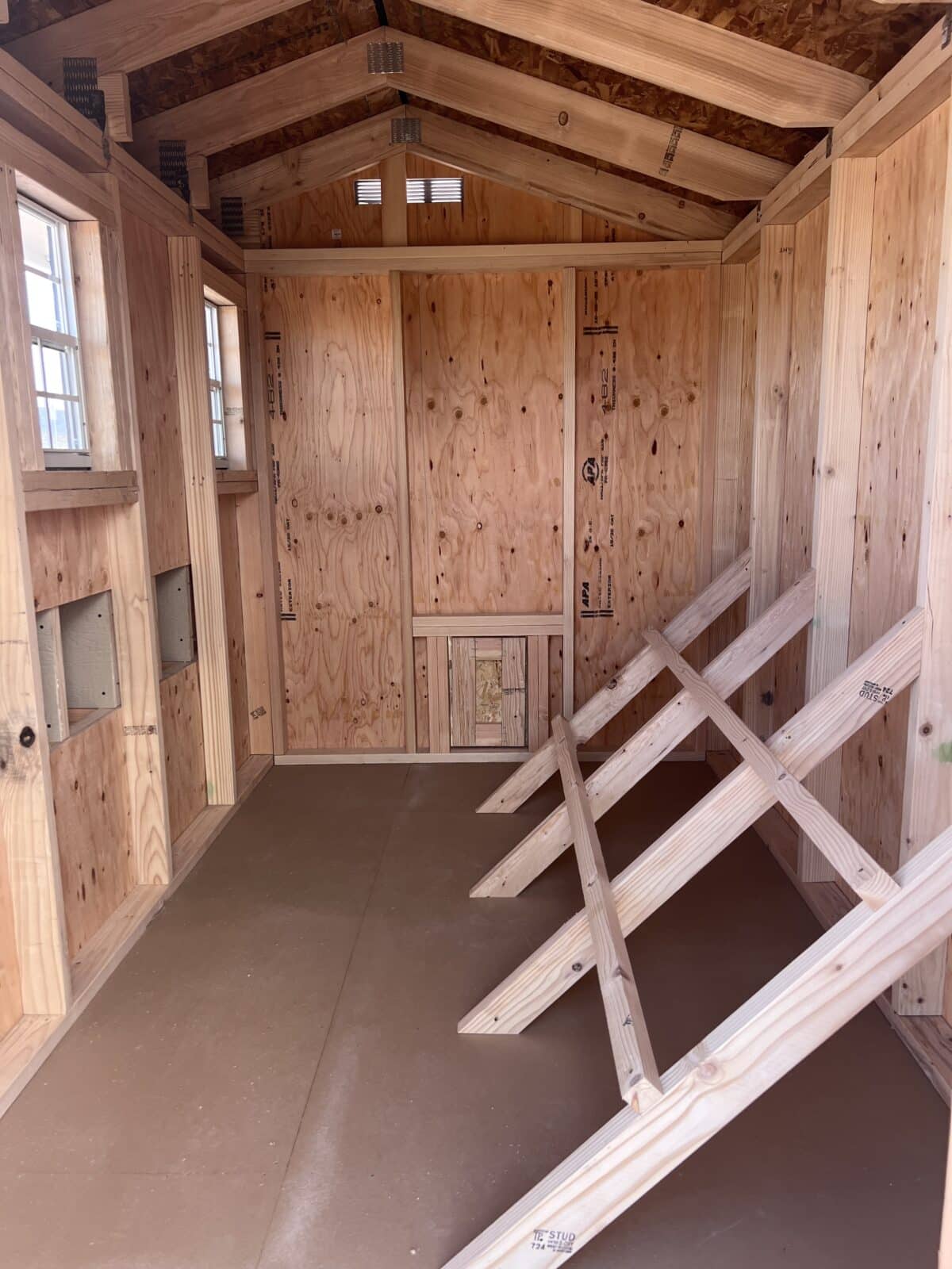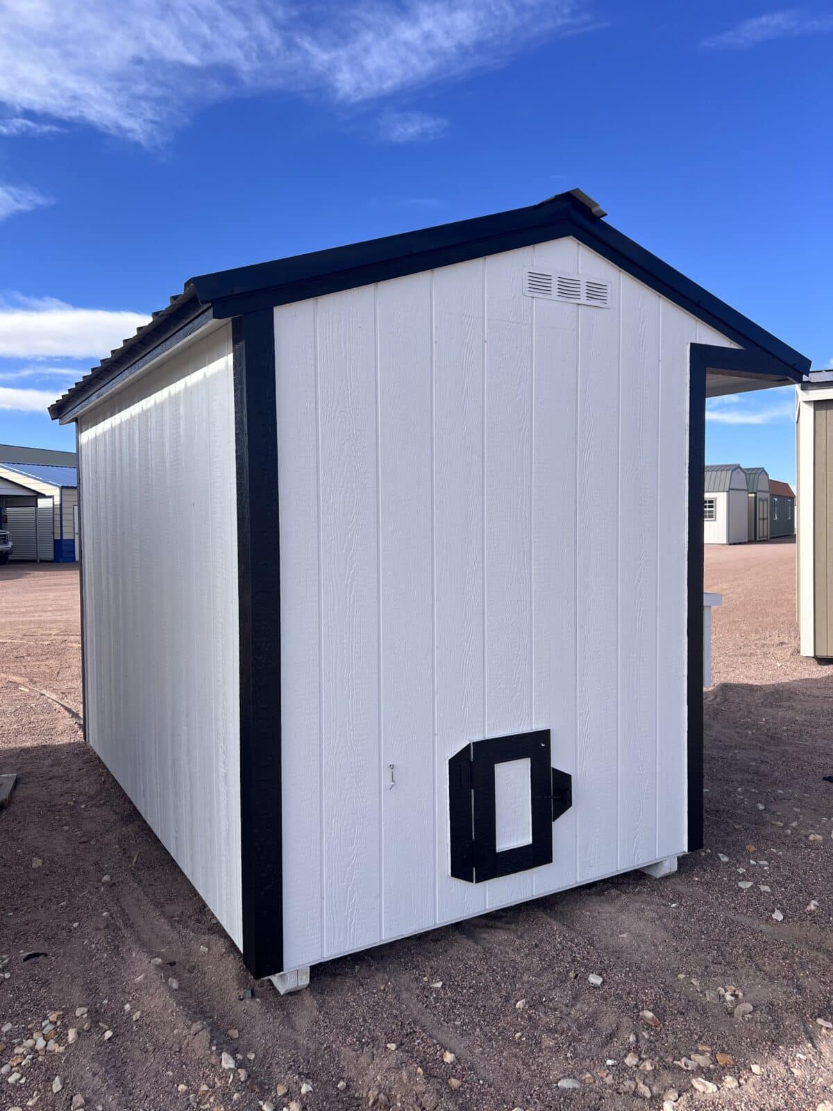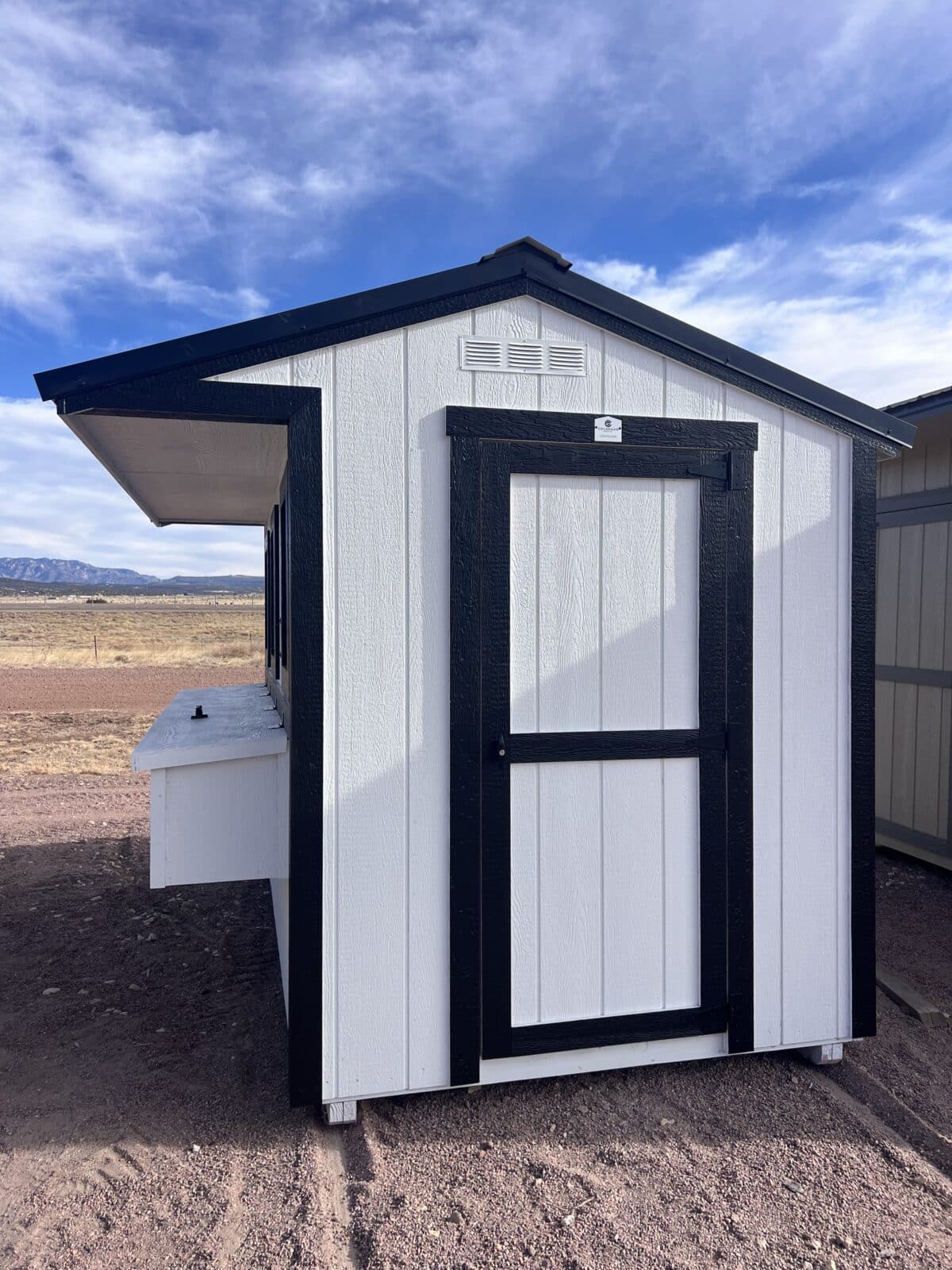 This charming 6×10 chicken coop combines classic style with practical design, featuring crisp Extra White painted siding, bold black painted trim, and a matching black metal roof for a clean, modern farmhouse look. Built for both convenience and comfort, it includes easy-access laying boxes that open from the outside, making egg collection quick and hassle-free. A large entry door allows for effortless cleaning and maintenance, while a smaller chicken door gives your flock safe, easy access to their run. Durable, functional, and eye-catching, this coop is a perfect blend of form and function for any backyard poultry setup.