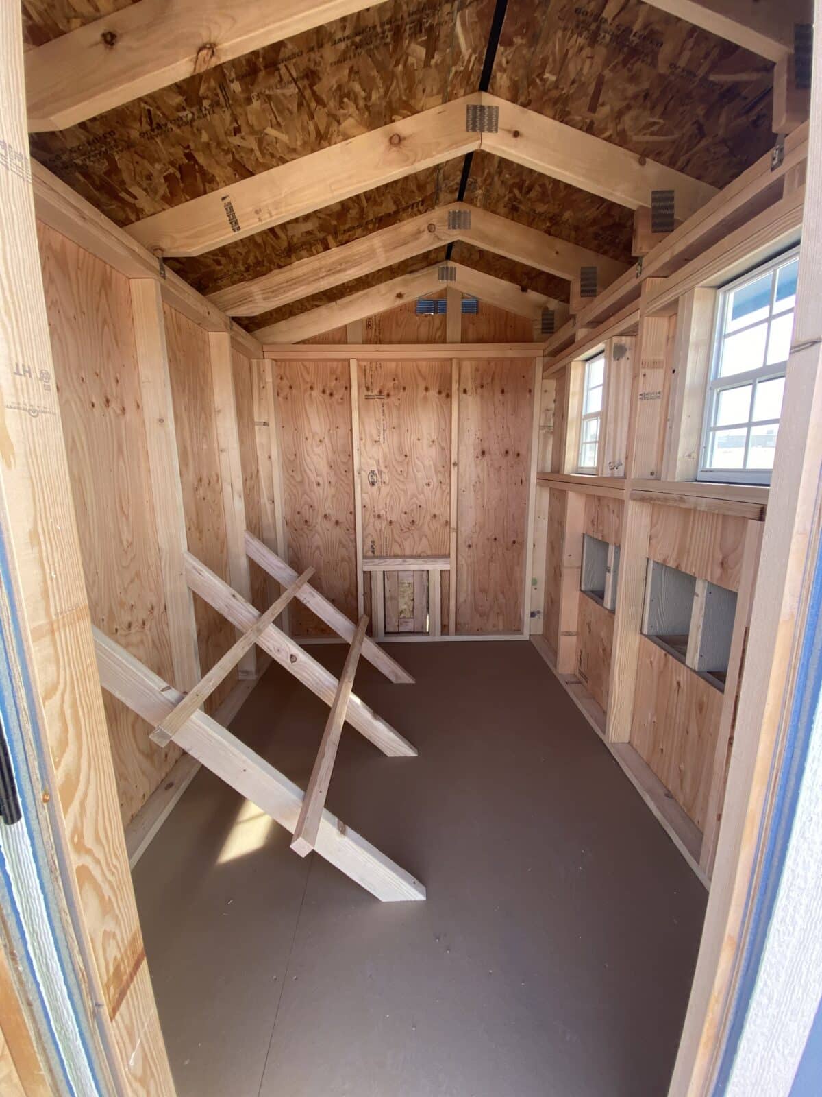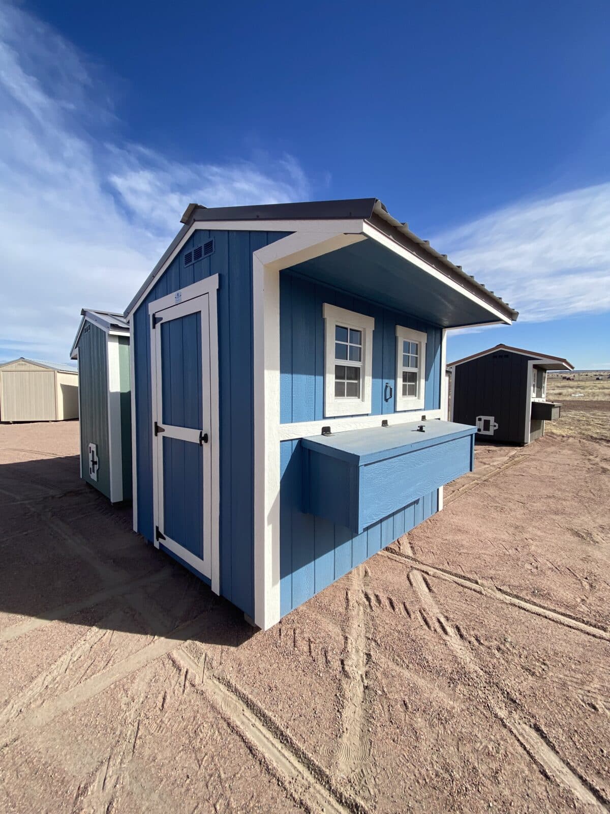 Needing some extra space and protection for your chickens? Check out this 6×8 chicken coop! It comes with a 36″ single door, nesting boxes, two 14×21 windows for light and ventilation along with a 12″x18″ chicken door. These coops don’t last long! This coop is painted Hawaiian Blue with Dover White trim and a Charcoal Gray roof.