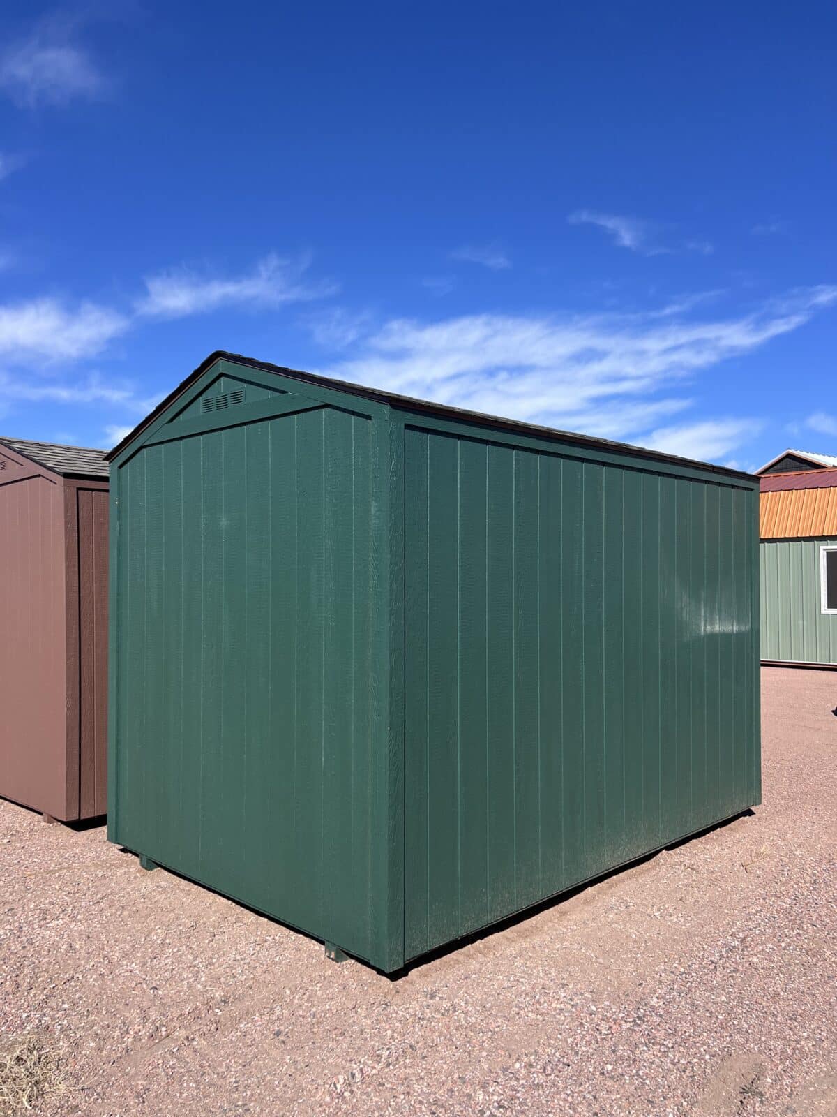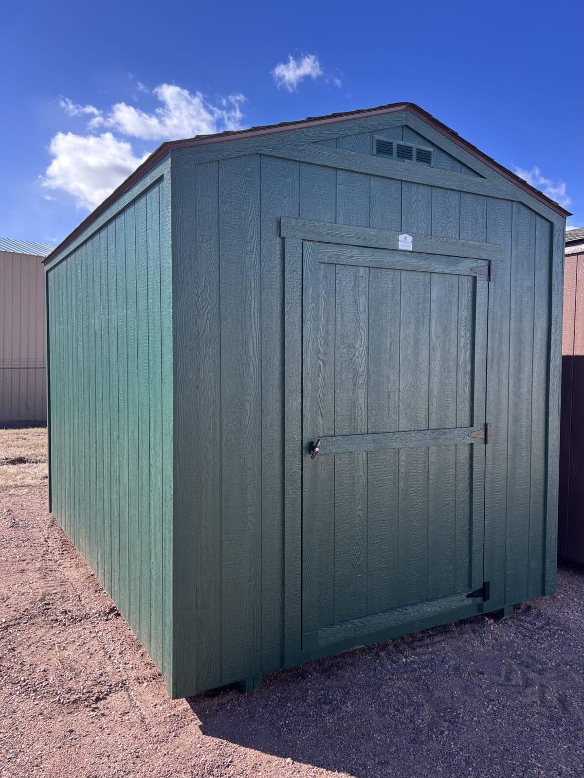 The Rapid Line Economy 8×12 shed offers a practical and affordable storage solution with a clean, classic look. Its compact yet spacious design provides ample room for tools, lawn equipment, and seasonal storage. The shed features a 48″ single door for easy access, making it simple to move larger items in and out. Painted in a rich Forest Green with matching trim, it blends naturally into outdoor surroundings while maintaining a polished appearance. A weathered wood shingled roof adds timeless charm and durability, completing a sturdy, attractive structure built for everyday functionality.