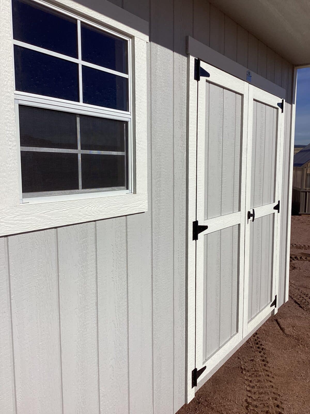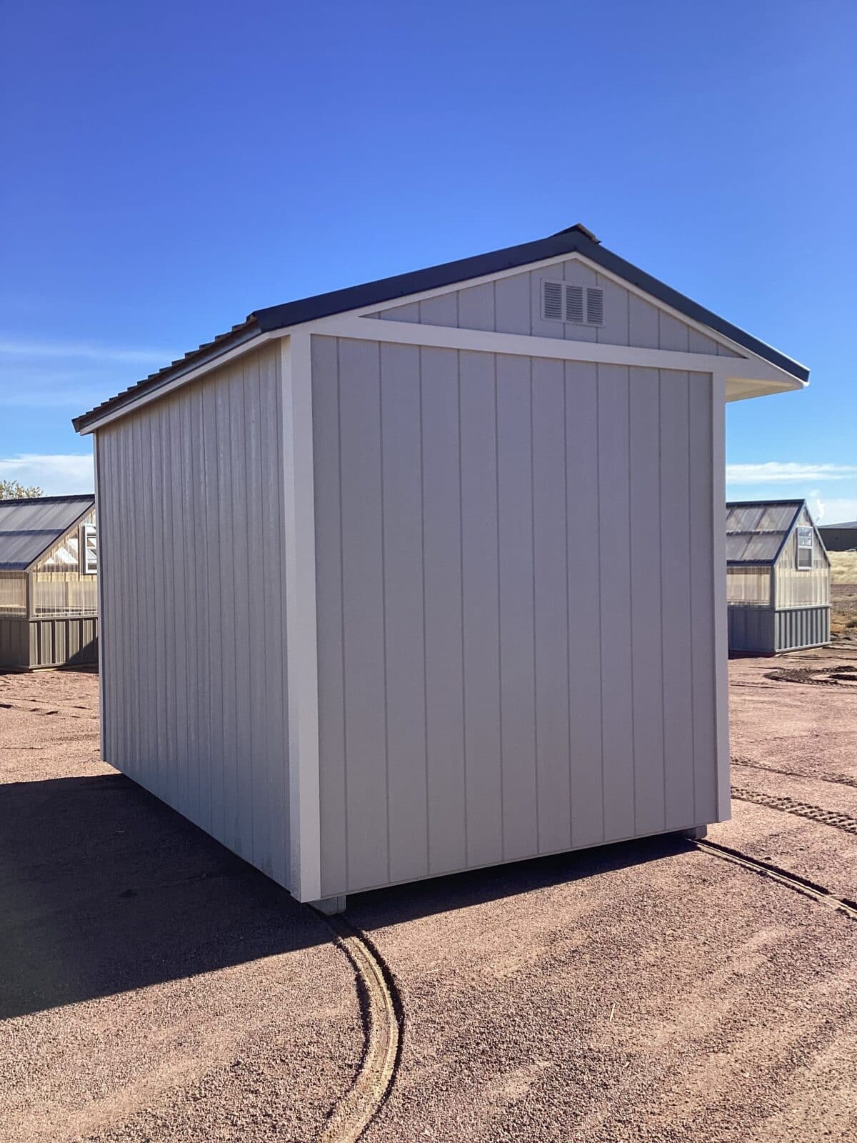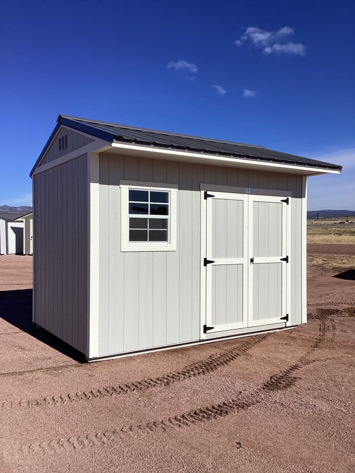 This 8×12 Tackroom style shed offers the perfect blend of charm and functionality, giving you a compact but efficient space for tool storage, gardening supplies, or small outdoor projects. This model features a wide 5′ double door for easy access to mowers and larger equipment, along with a 24″x27″ window that brings in plenty of natural light and ventilation. Built with quality materials and a timeless garden-shed aesthetic, it provides a durable, attractive storage solution that enhances any backyard. It is painted Repose Gray with Dover White trim and a Charcoal Gray metal roof.