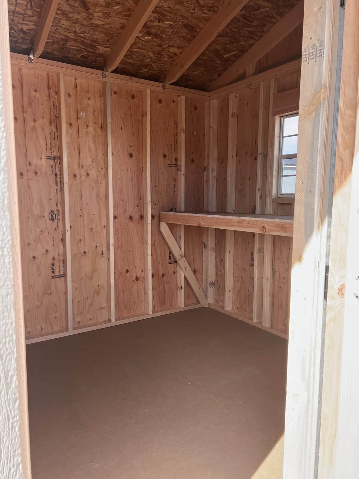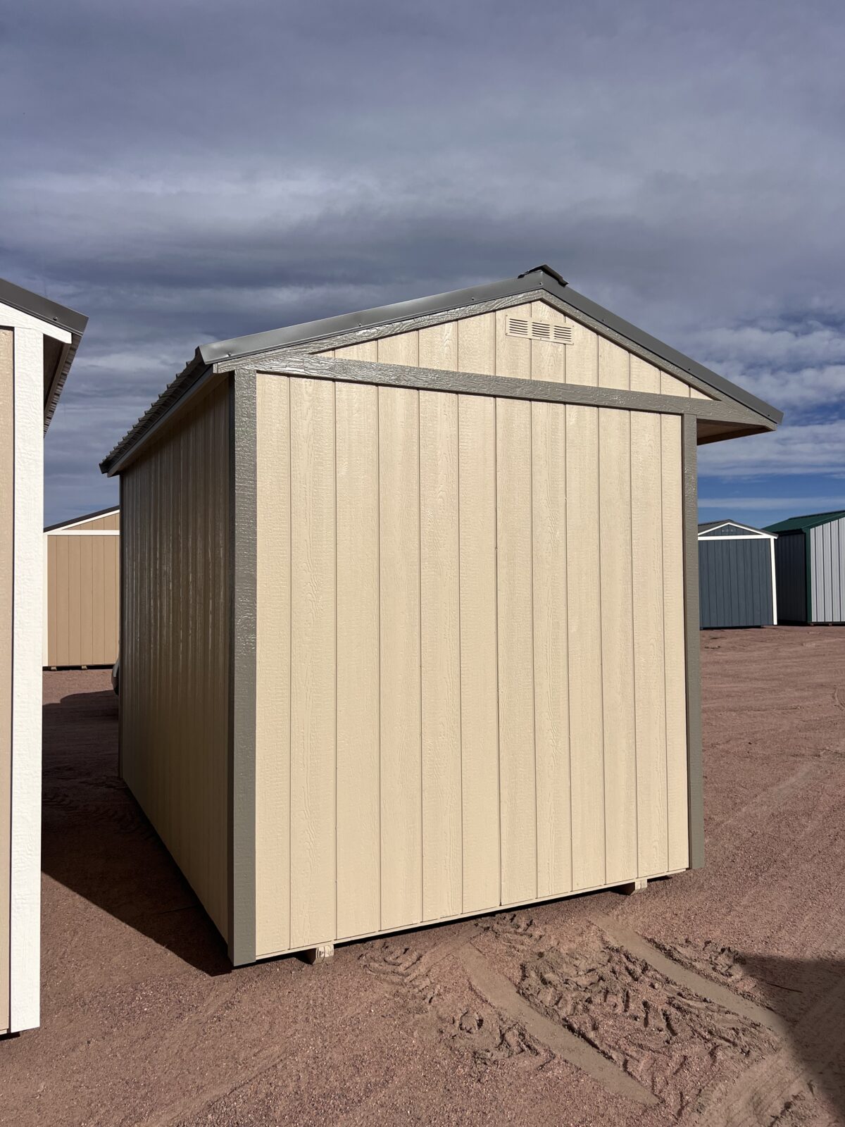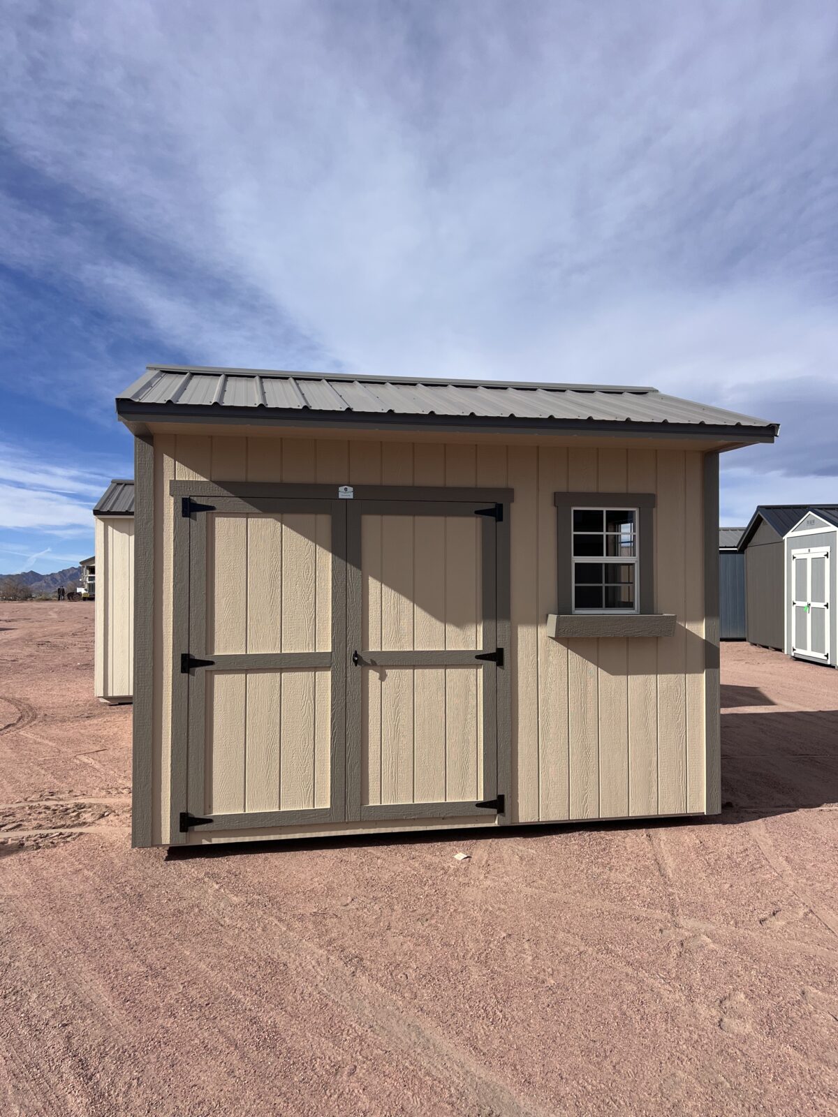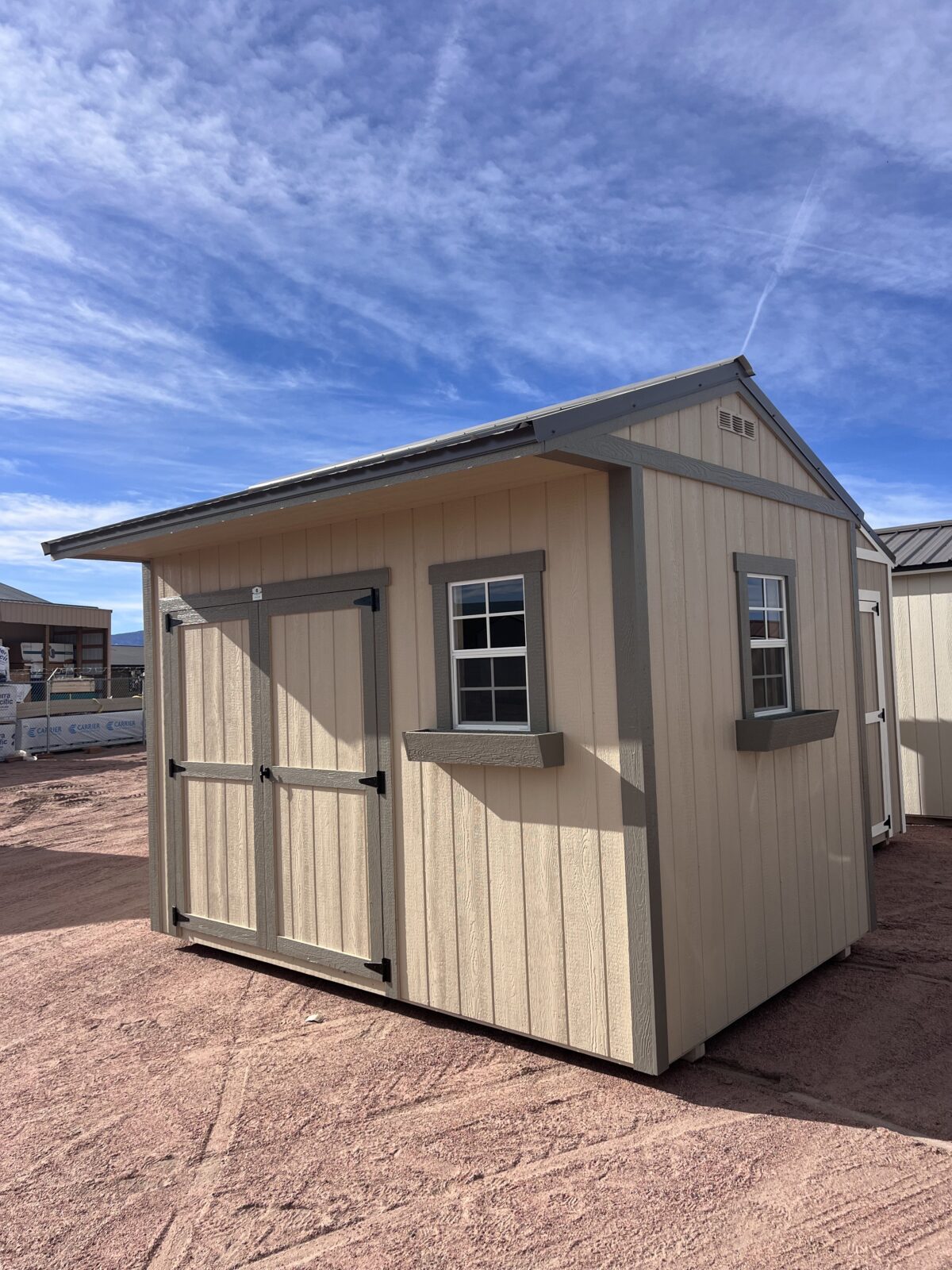 Experience practical convenience and clean style with this 8×12 Tackroom-Style Shed, designed to keep your space organized and ready for work. It features a wide 6′ double door for easy access to equipment, tools, or seasonal storage. The exterior combines Barcelona Beige painted siding with crisp Anonymous trim and a durable Charcoal Gray metal roof for a sharp, modern look. Inside, a built-in 2′ workbench offers a dedicated space for projects or potting, while two 18×27 windows fill the interior with natural light. A charming flower box on the exterior adds the perfect finishing touch, making this shed as attractive as it is functional.